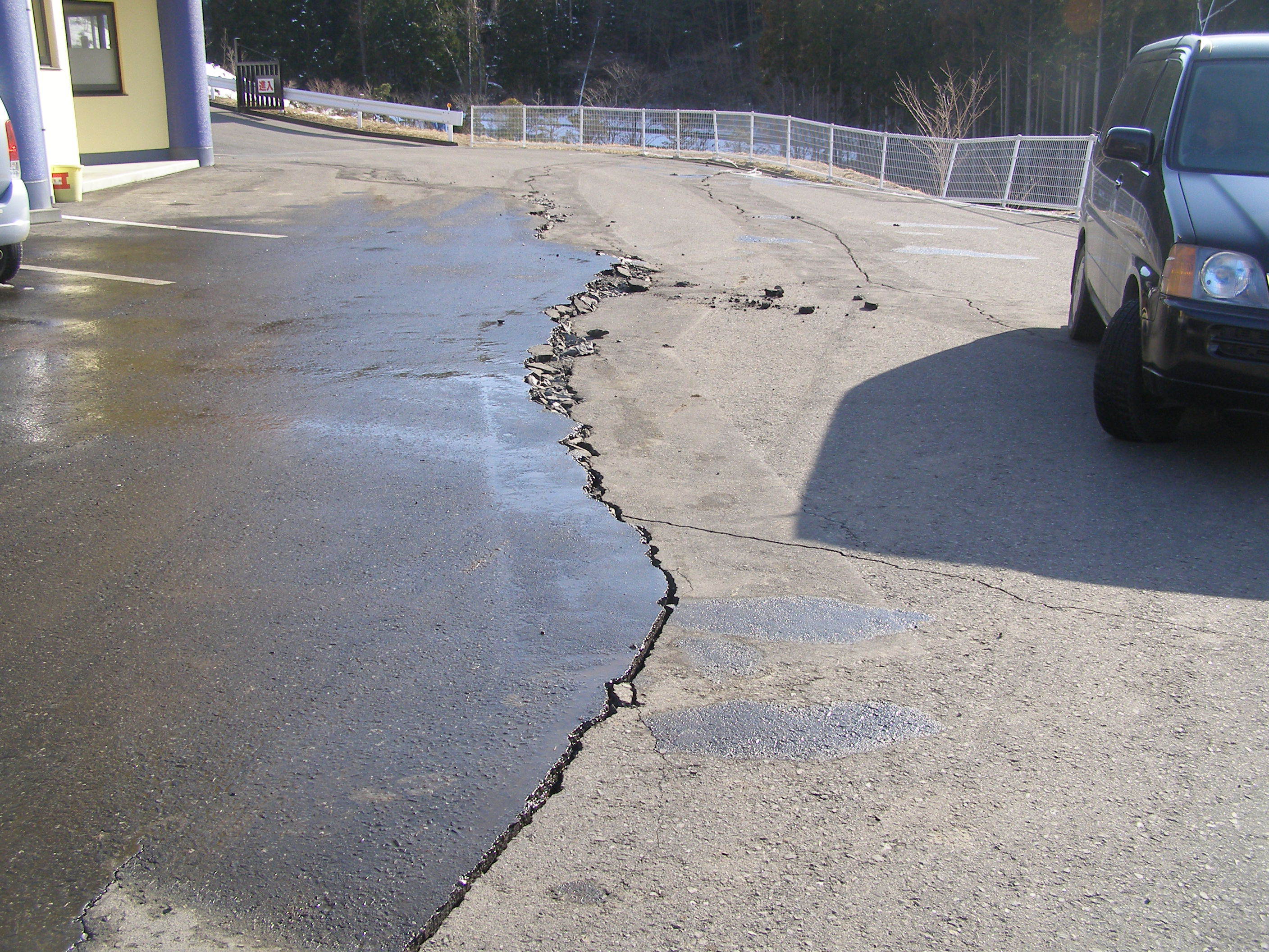 地震で被災したらふたぁヒルズ。施設内の駐車場もアスファルトが盛り上がっている。