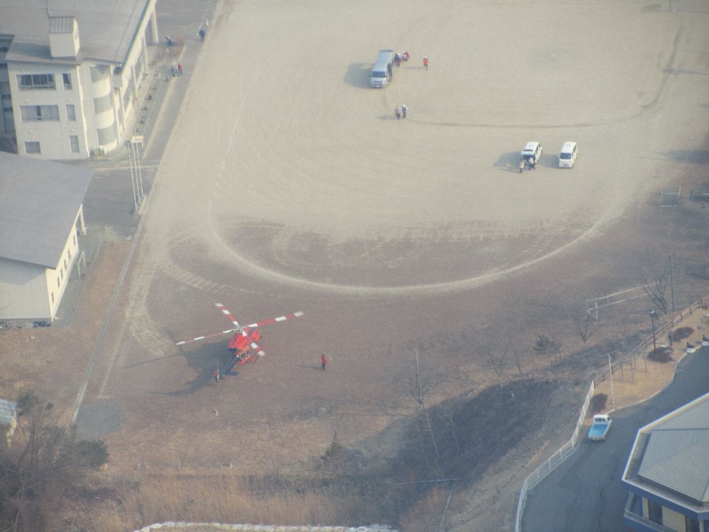 吉里吉里中の校庭に着陸するヘリ。周囲には人影も見える。