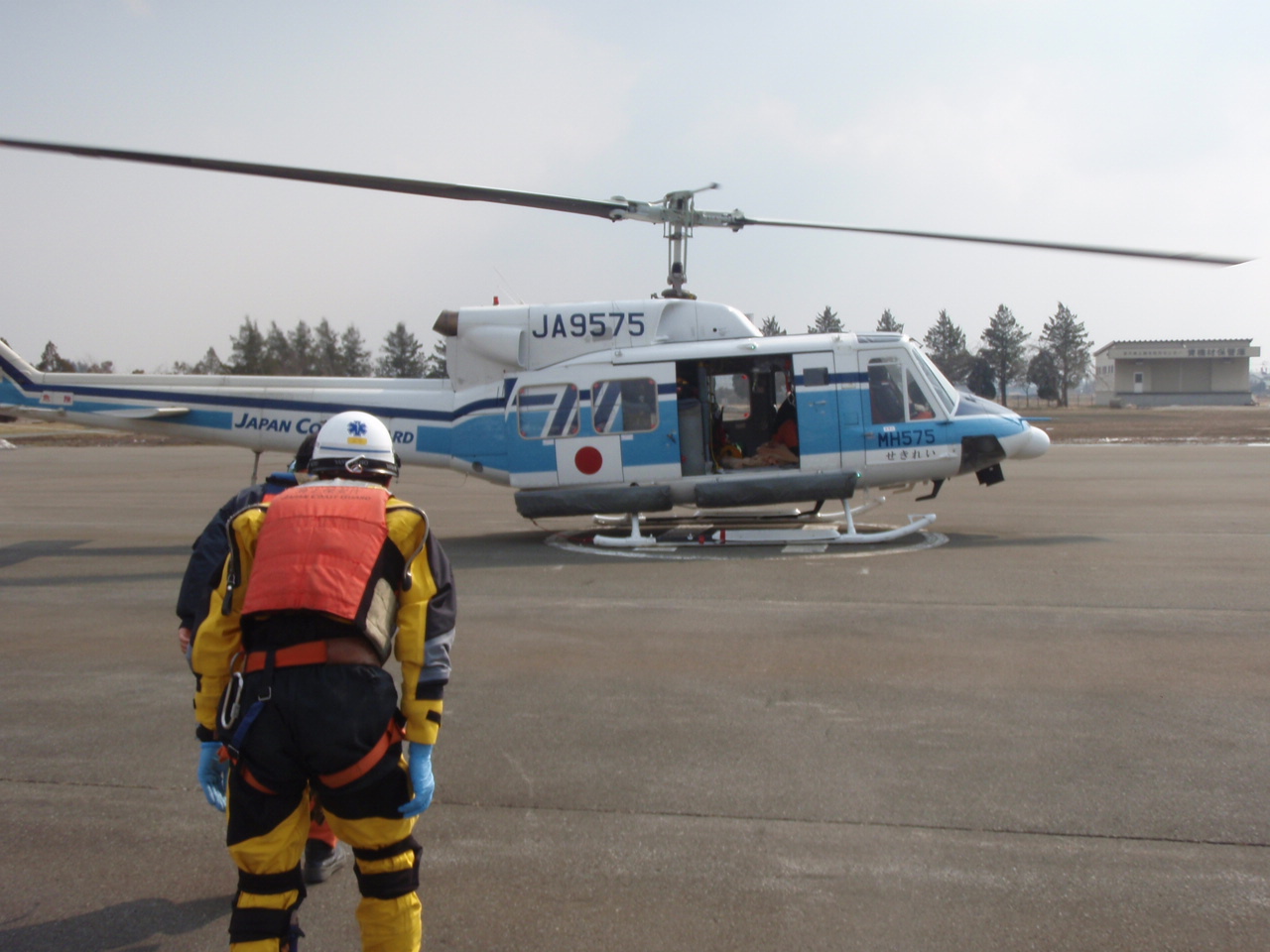 被災地に向かうために準備をするヘリコプター。打ち合わせをする隊員の姿も見える。