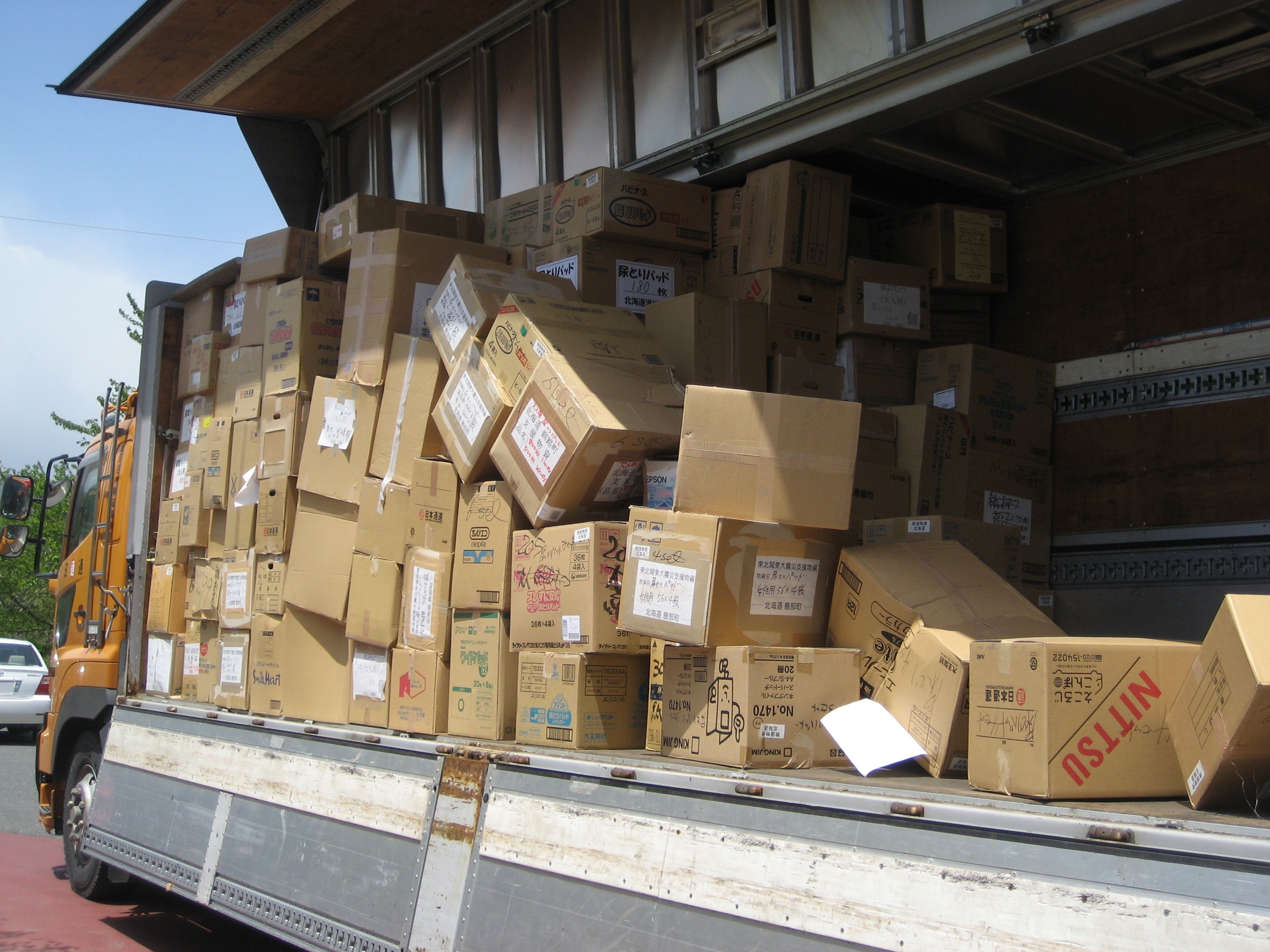 北海道からの、日本通運トラックによる、支援物資配送。介護用品など。