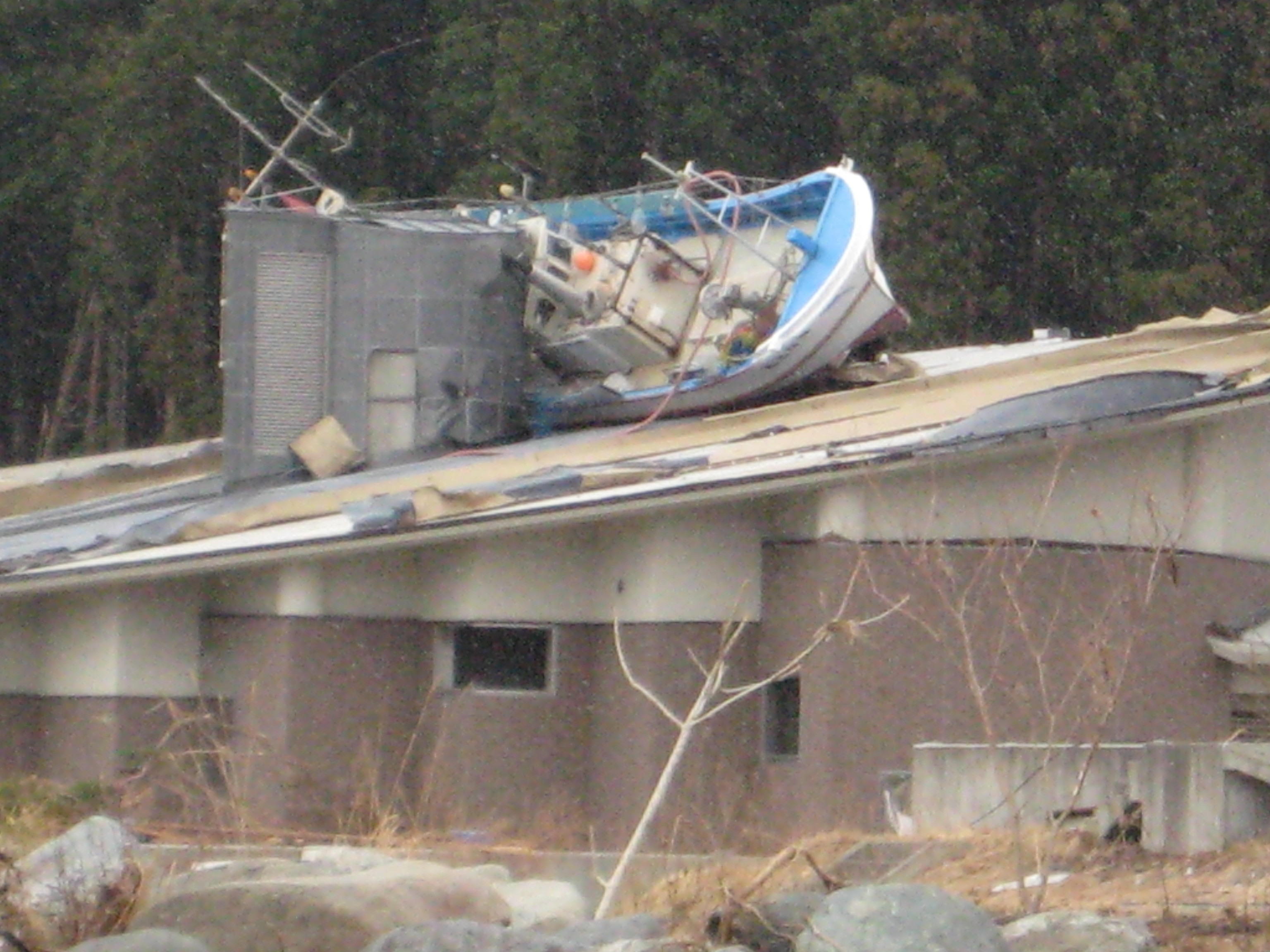 吉里吉里地区漁業集落排水処理施設の被災状況。屋上に船がのりあげている。