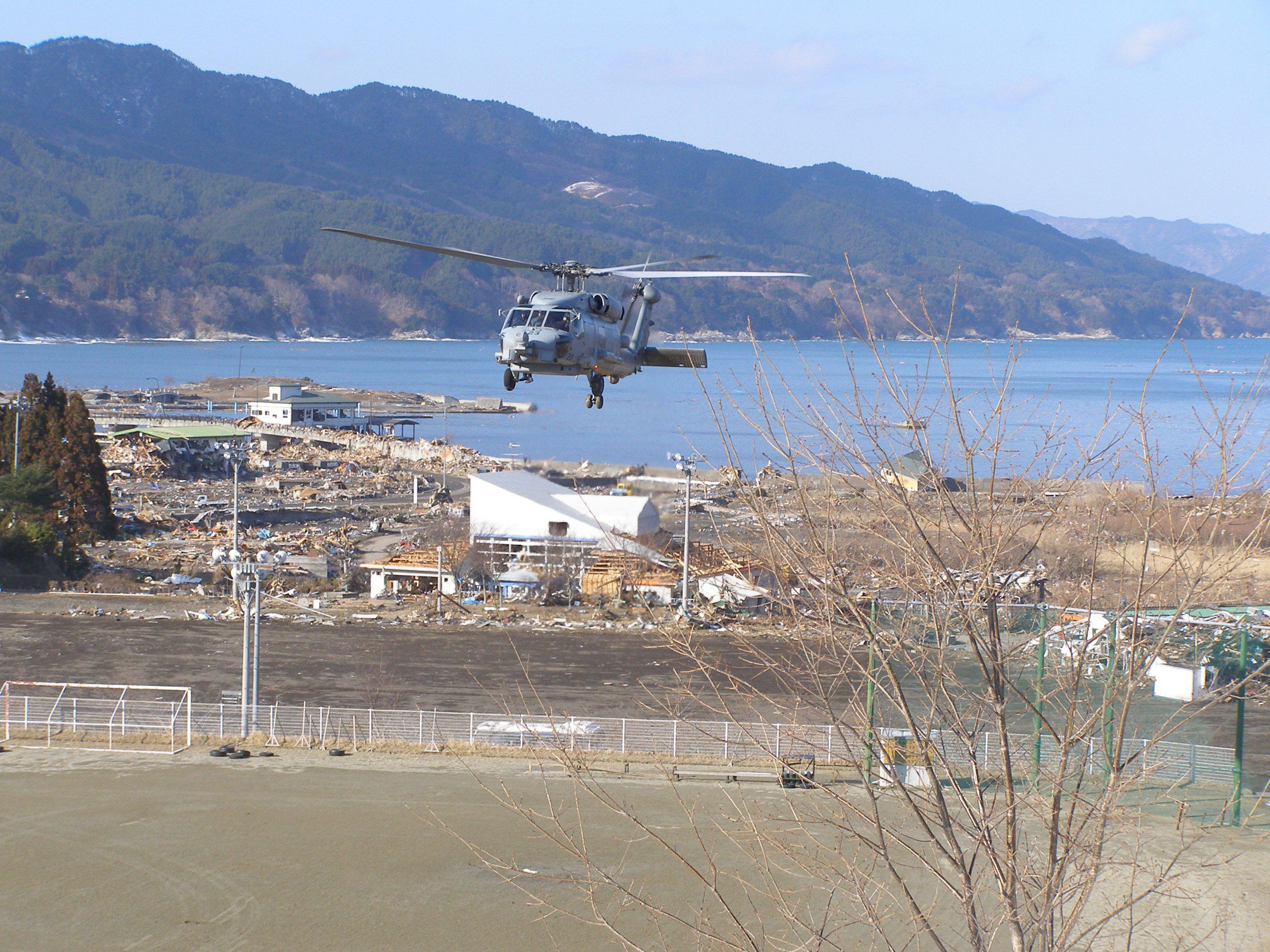 中学校校庭に自衛隊のヘリコプターが着陸する直前の様子(特別養護老人ホームらふたぁヒルズより撮影)