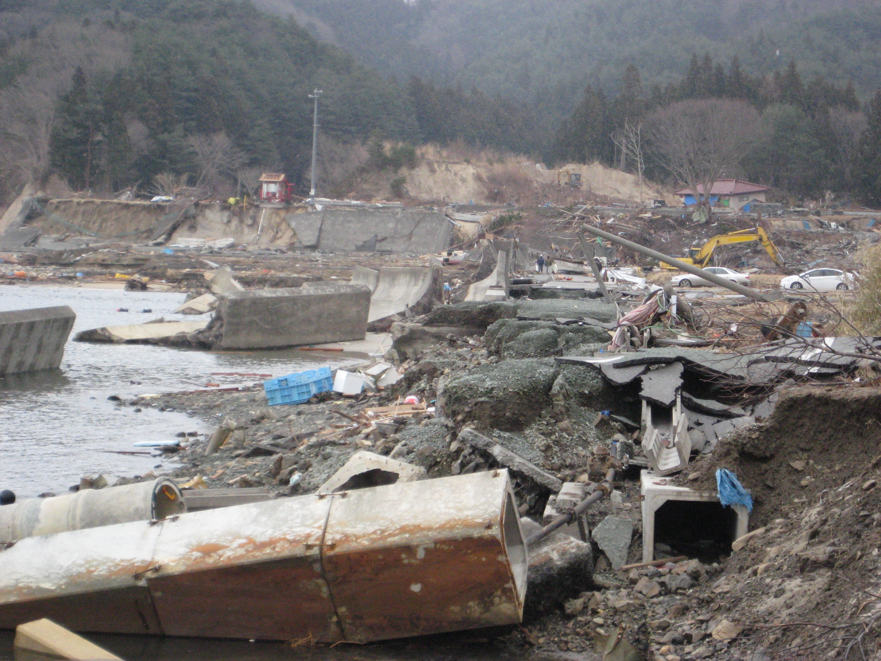 吉里吉里地区、海岸の被災状況。堤防や道路が壊れている。