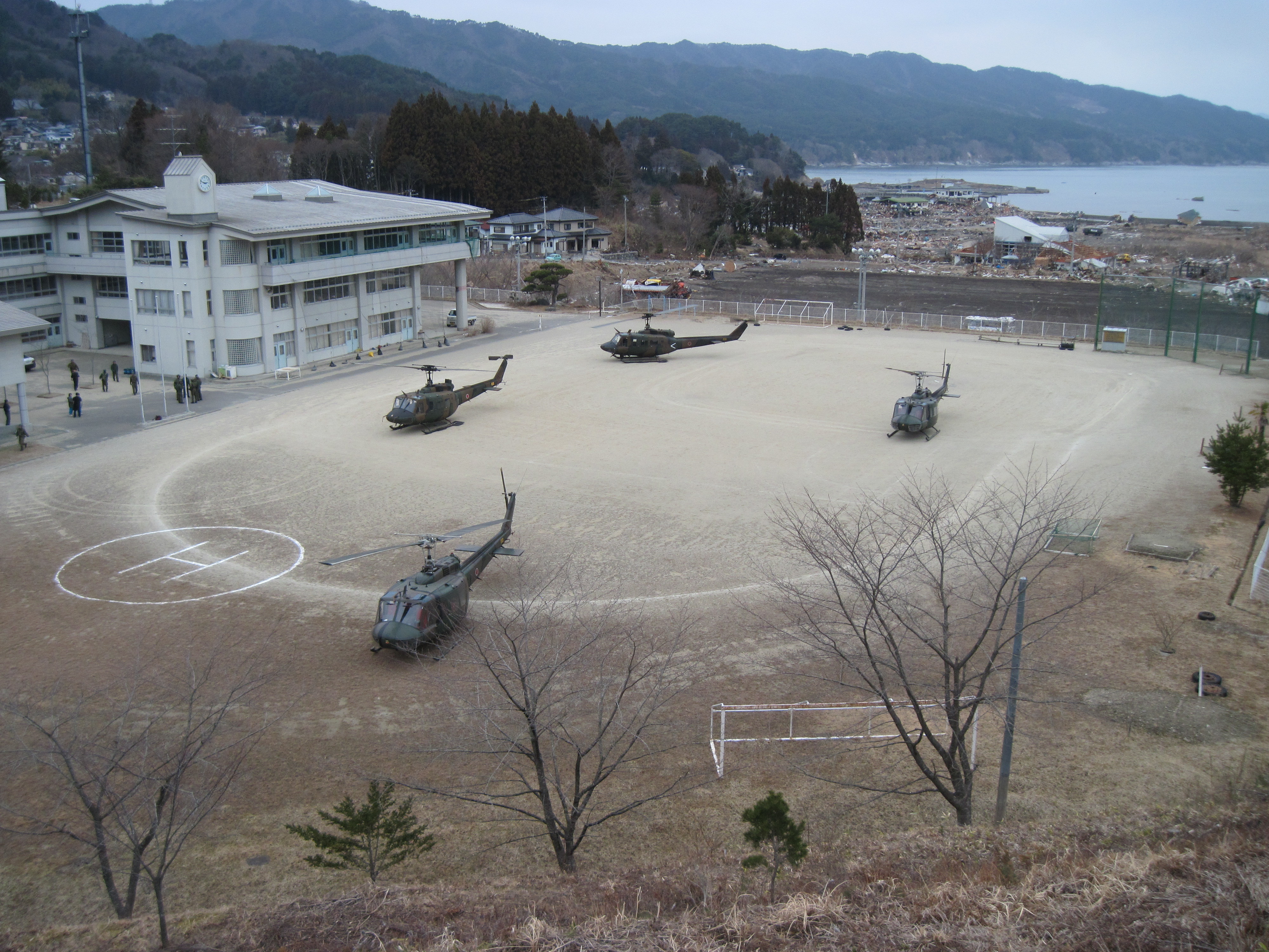吉里吉里中学校校庭が、ヘリポートになっており、ヘリコプター4機が着陸している。