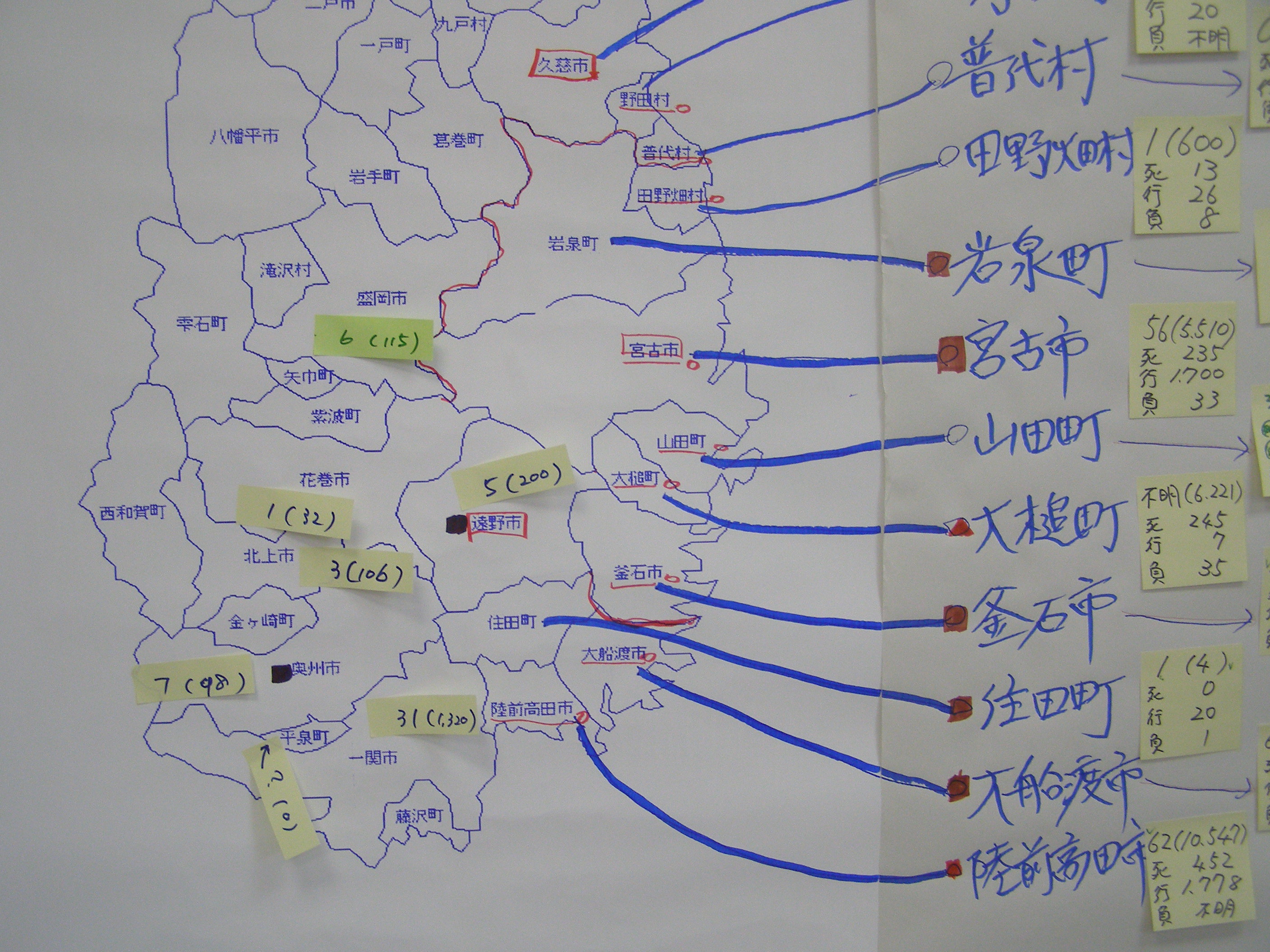 岩手県内の市町村別の、死者、行方不明者、負傷者数一覧表。