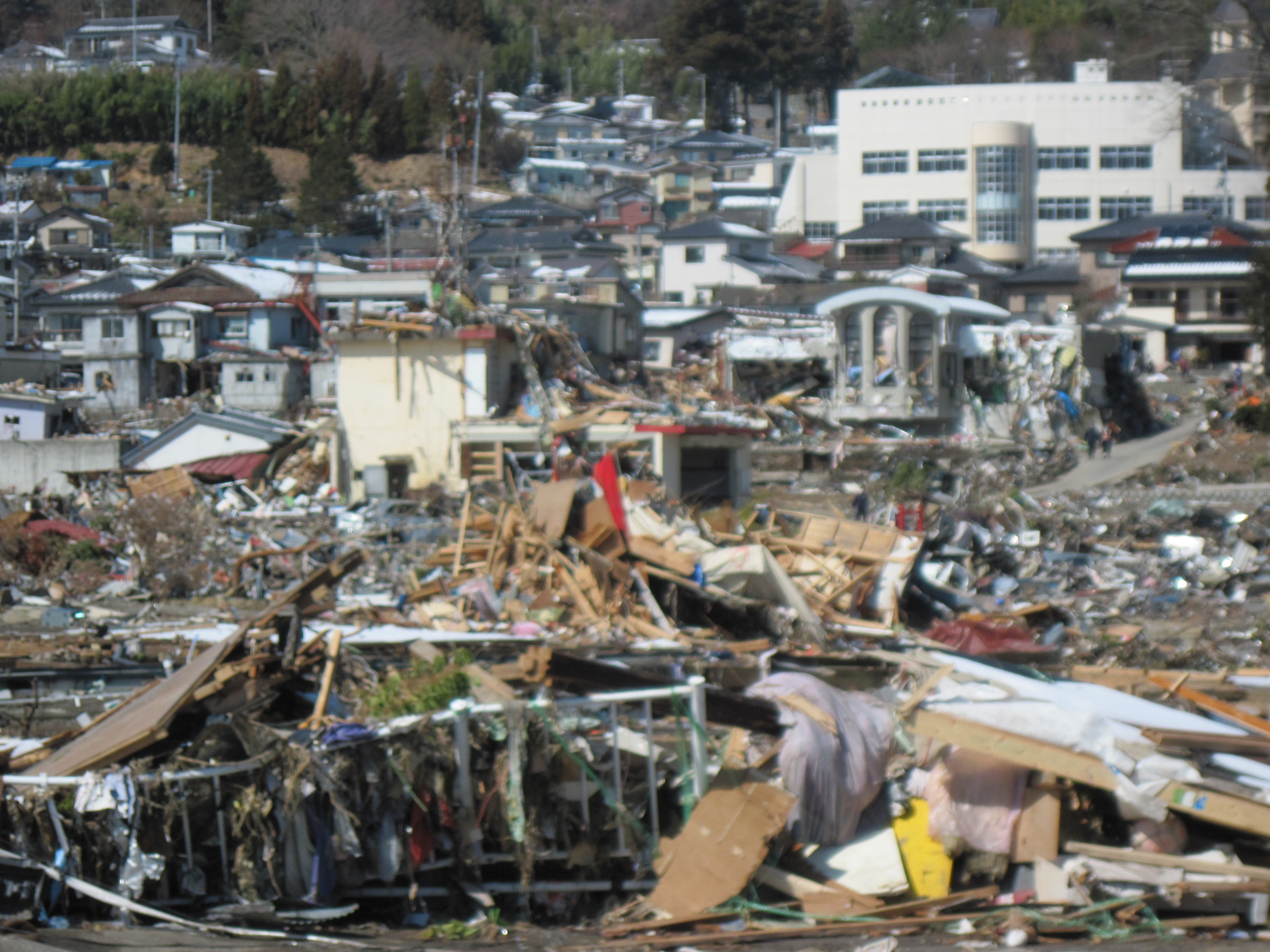 吉里吉里小学校遠景。住宅地は、被災している。