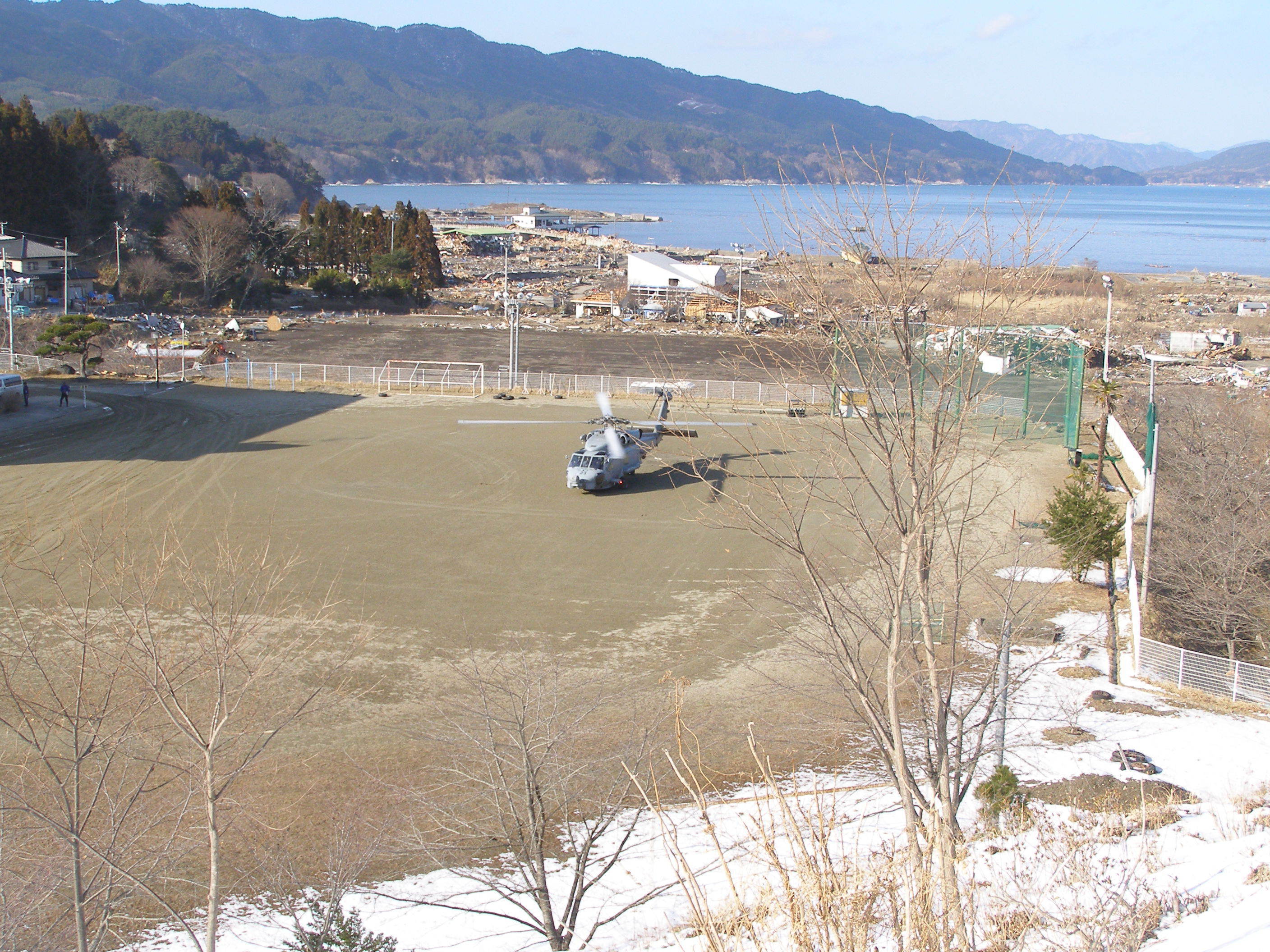 雪の残る吉里吉里中学校校庭にヘリコプター。