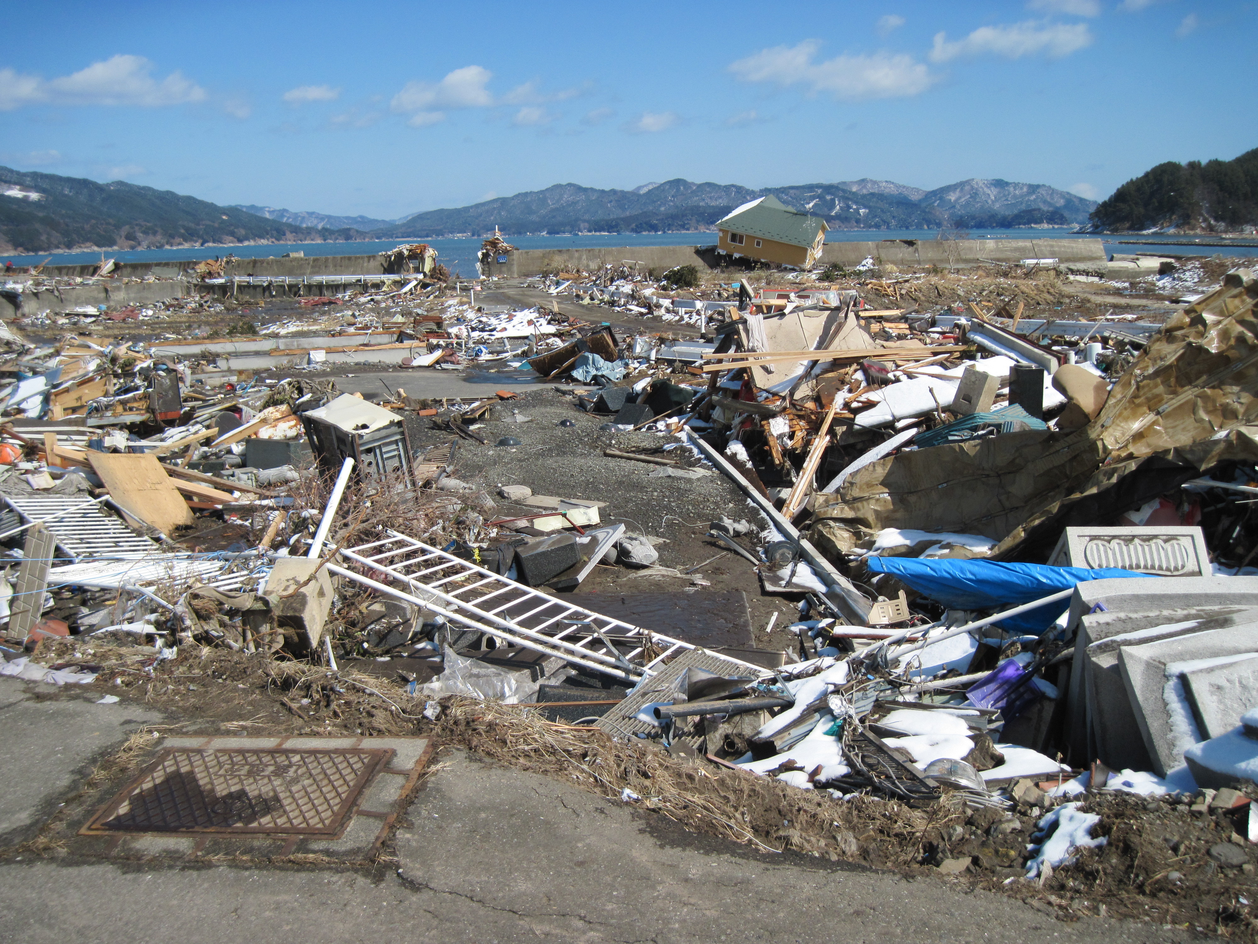 吉里吉里海岸 国道45号から、海岸中央部を撮影。家屋やガレキが散乱している。
