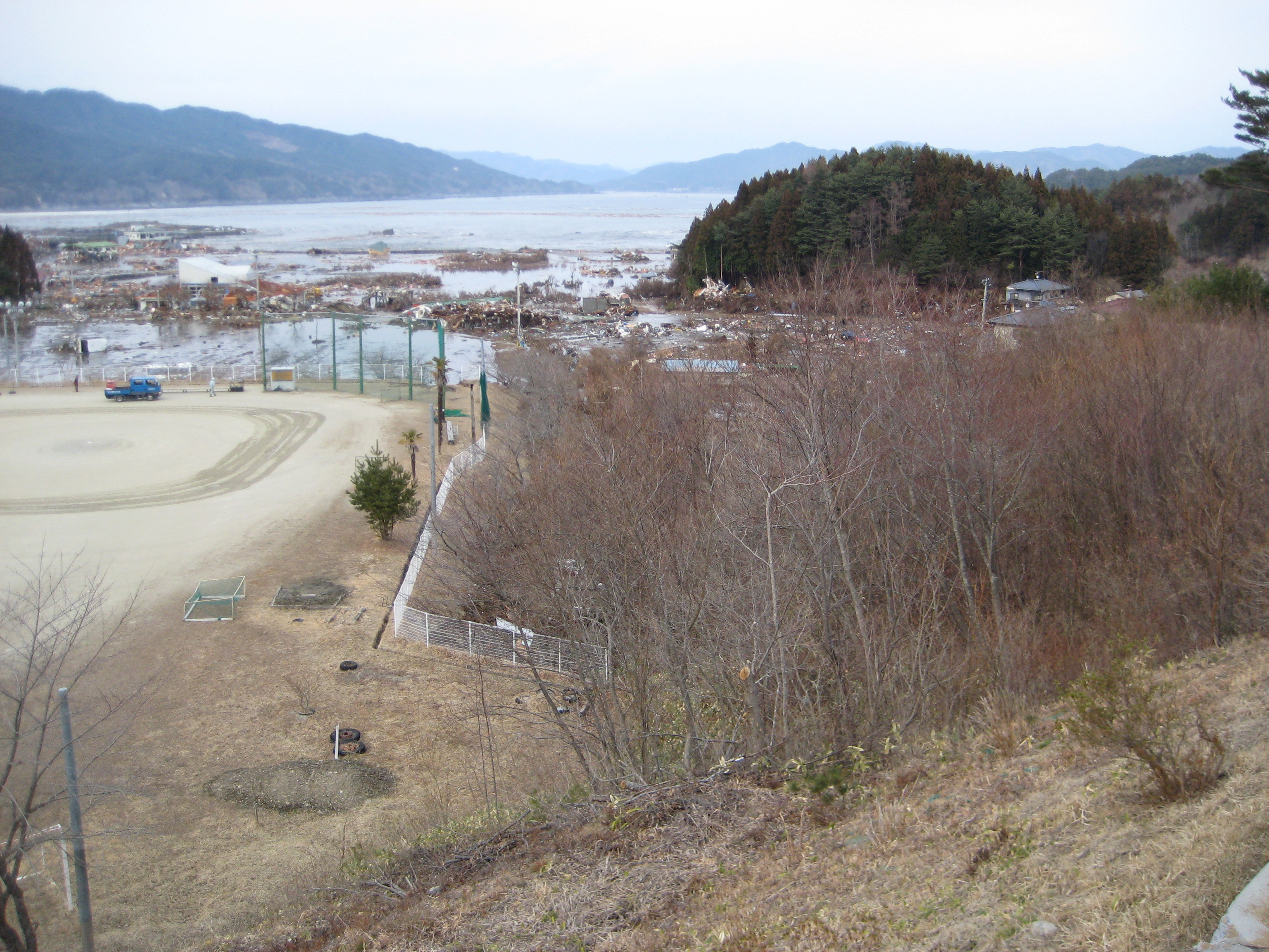 らふたぁヒルズから見た、吉里吉里海岸および町内の津波襲来状況