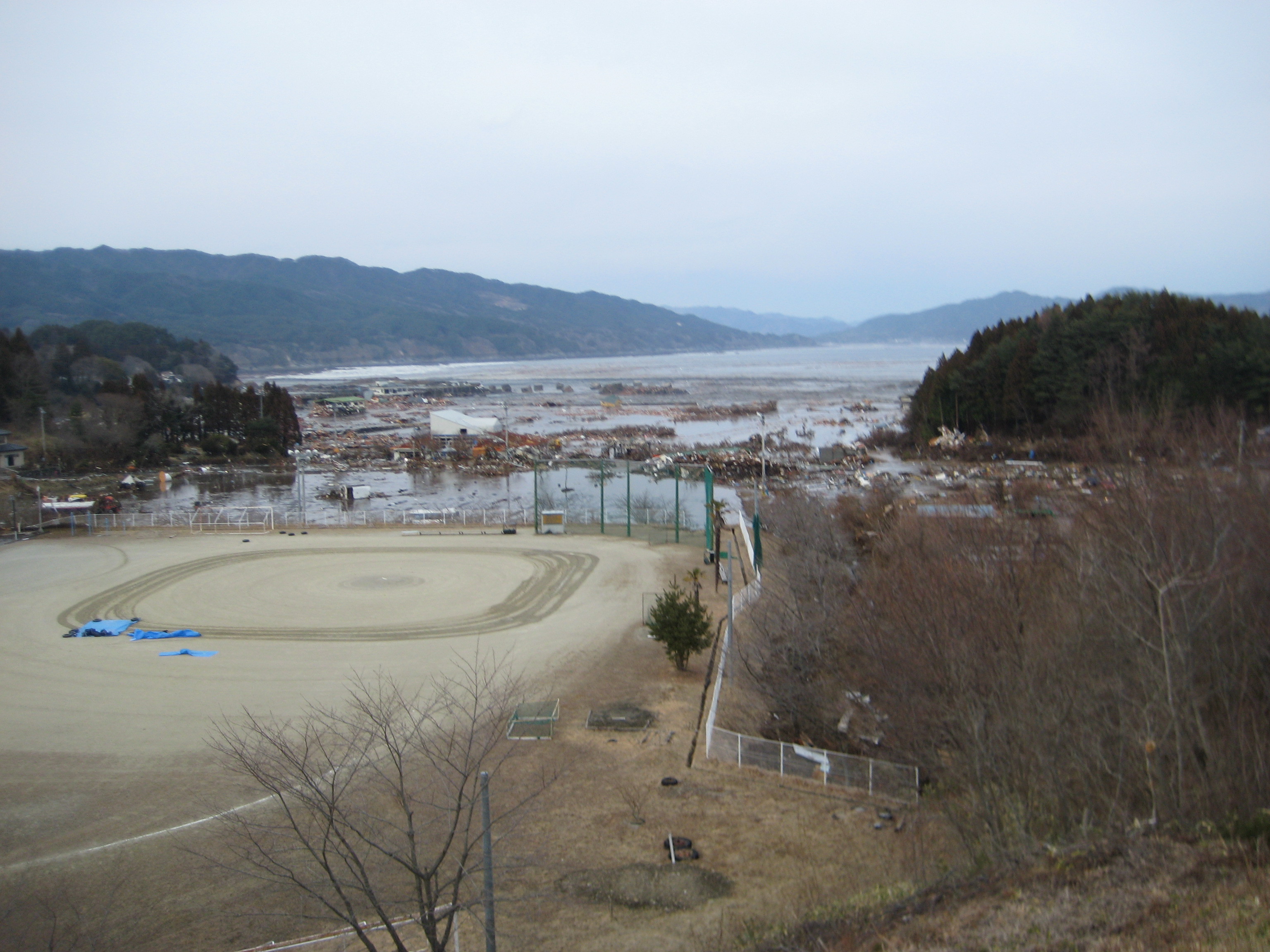 らふたぁヒルズから見た、吉里吉里海岸および町内の津波襲来状況