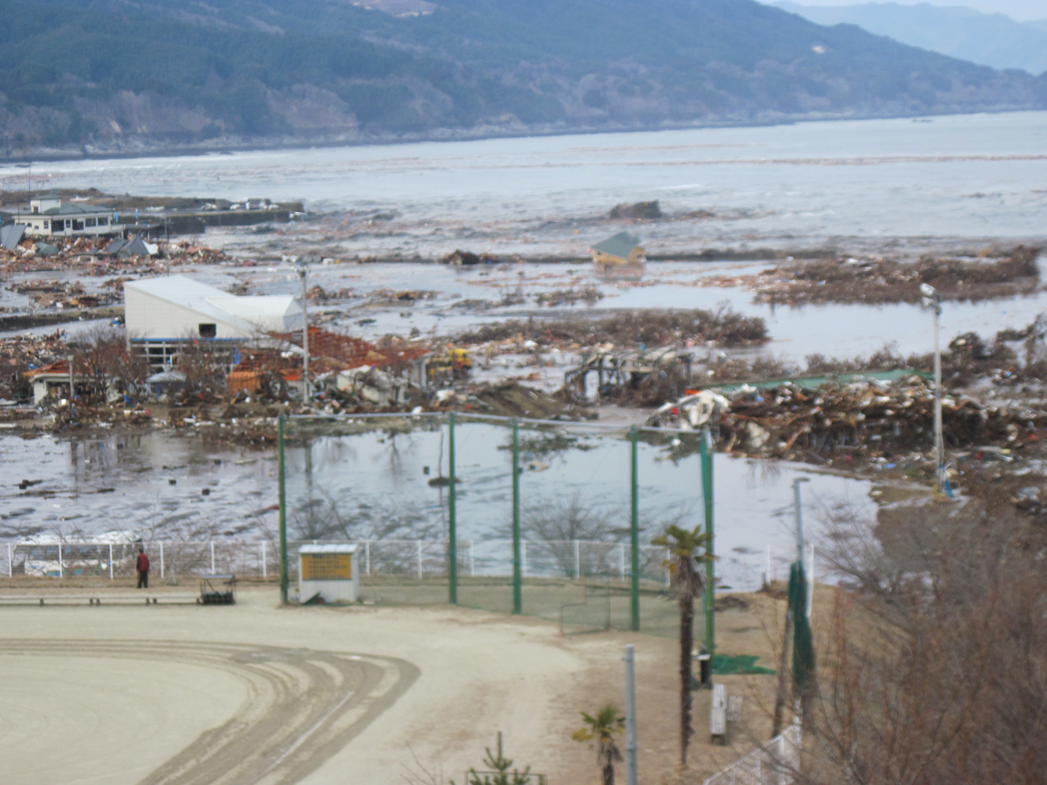 らふたぁヒルズから見た、吉里吉里海岸および町内の津波襲来状況