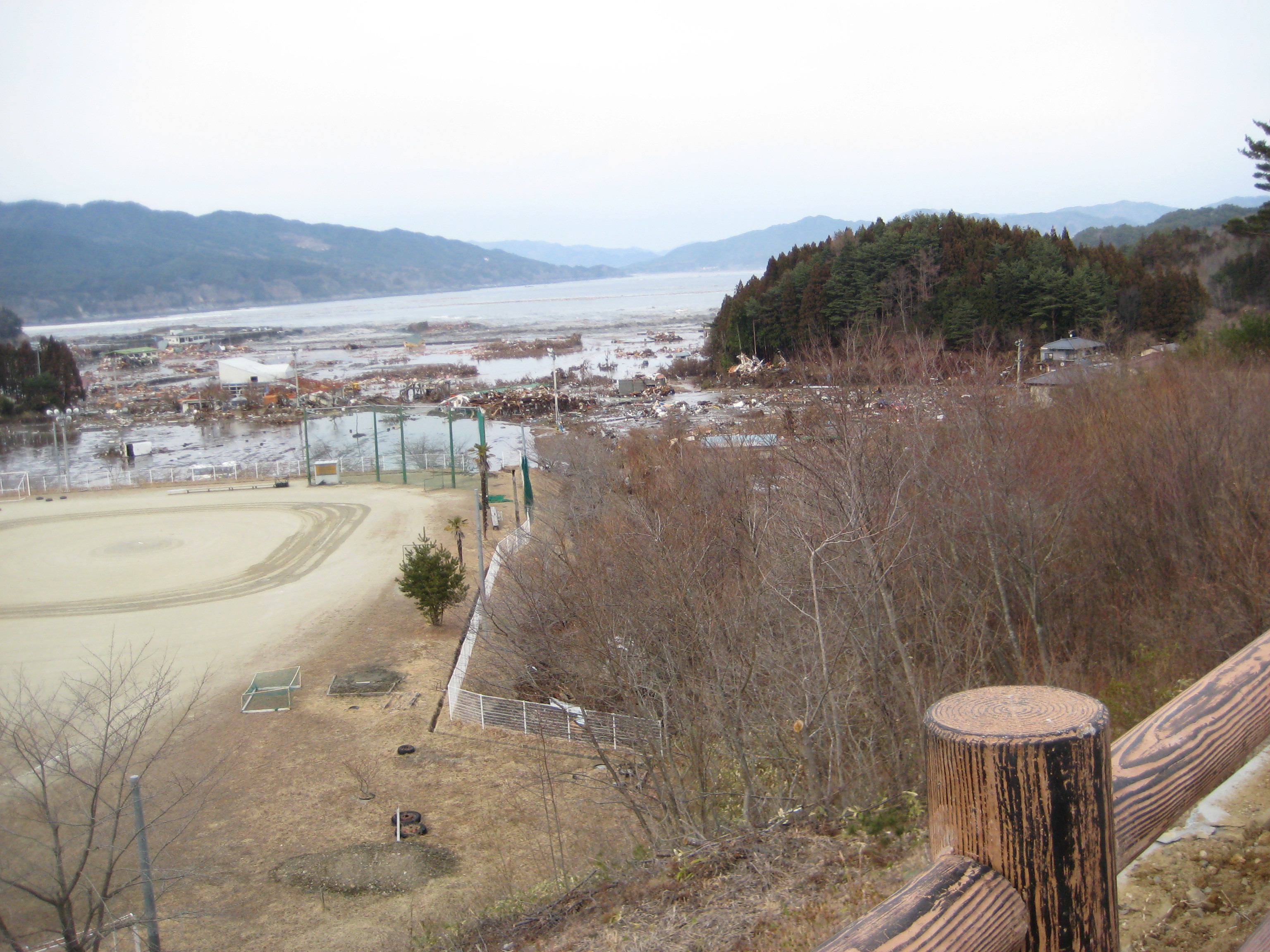 らふたぁヒルズから見た、吉里吉里海岸および町内の津波襲来状況