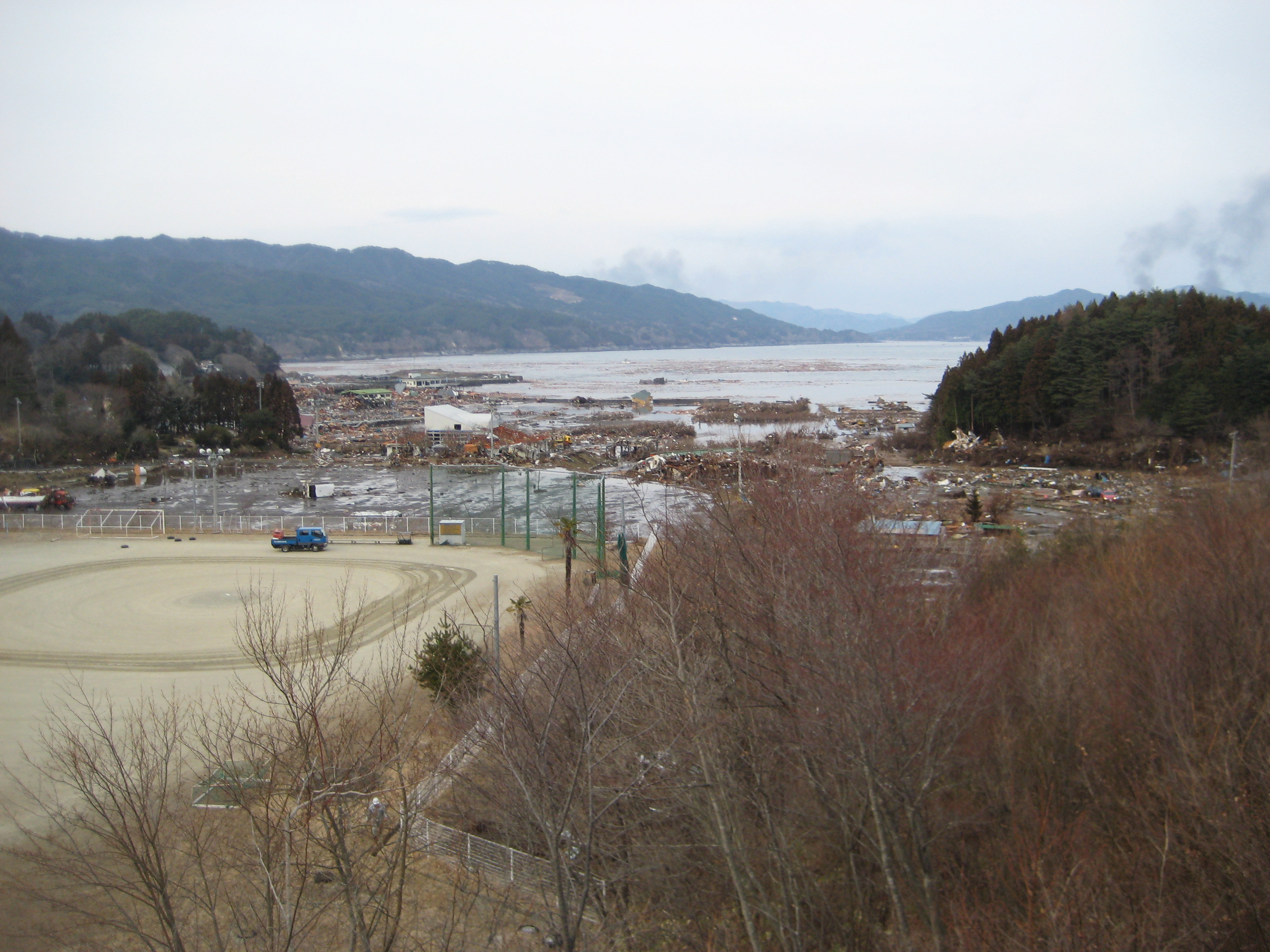 らふたぁヒルズから見た、吉里吉里海岸および町内の津波襲来状況