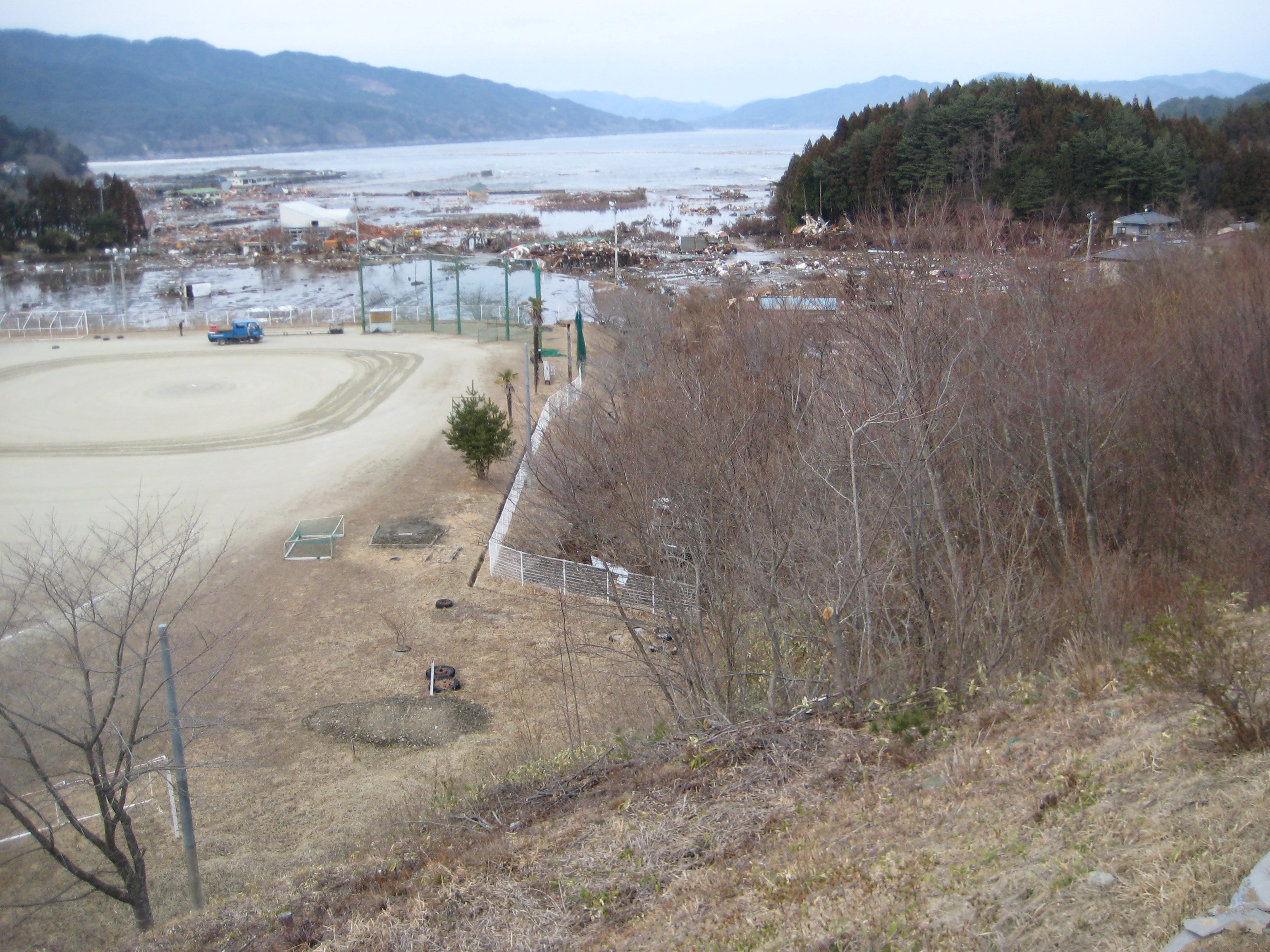 らふたぁヒルズから見た、吉里吉里海岸および町内の津波襲来状況