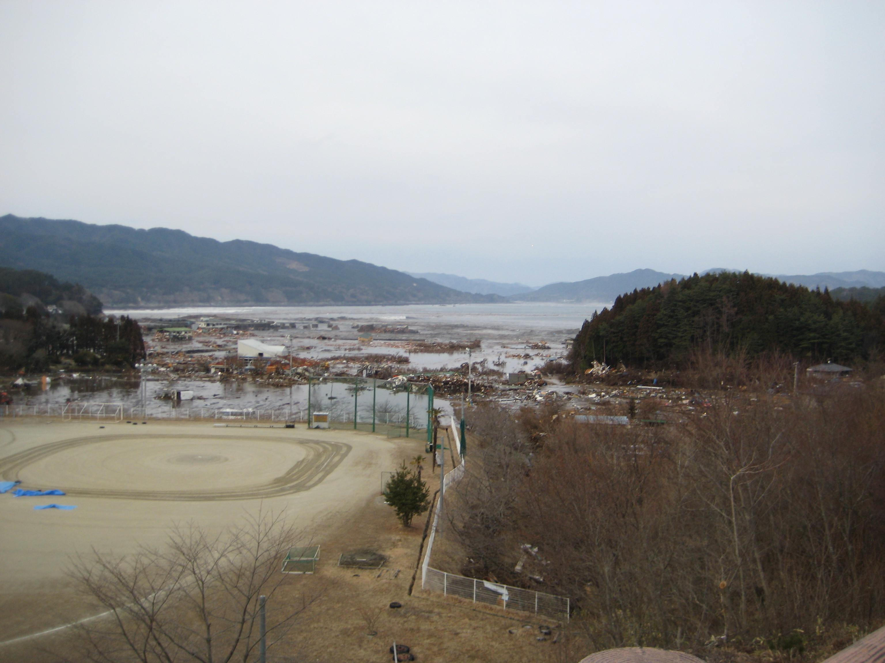 らふたぁヒルズから見た、吉里吉里海岸および町内の津波襲来状況