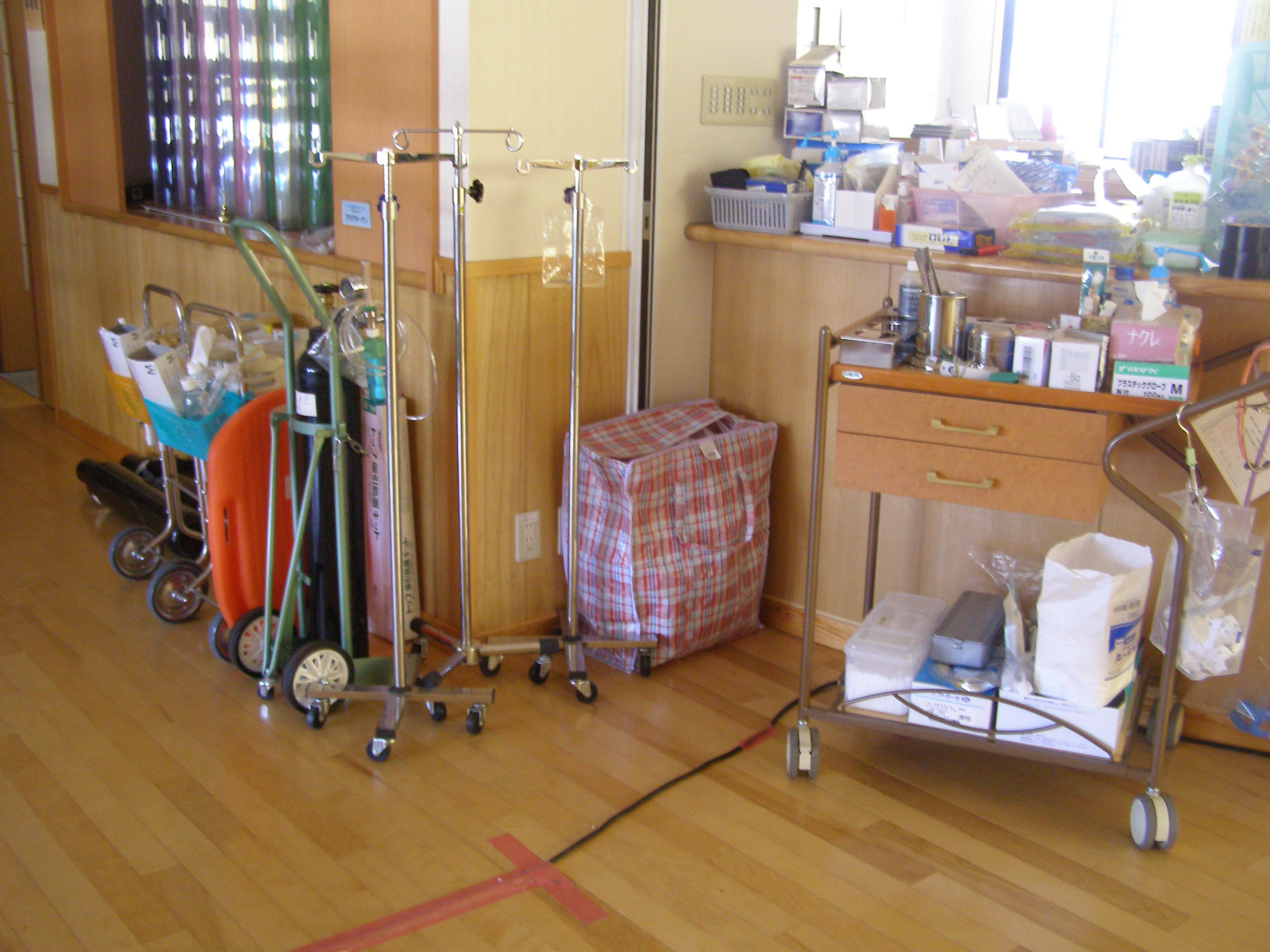 ホームでの避難生活。廊下でも、寝泊りがなされ、物品が置かれている。
