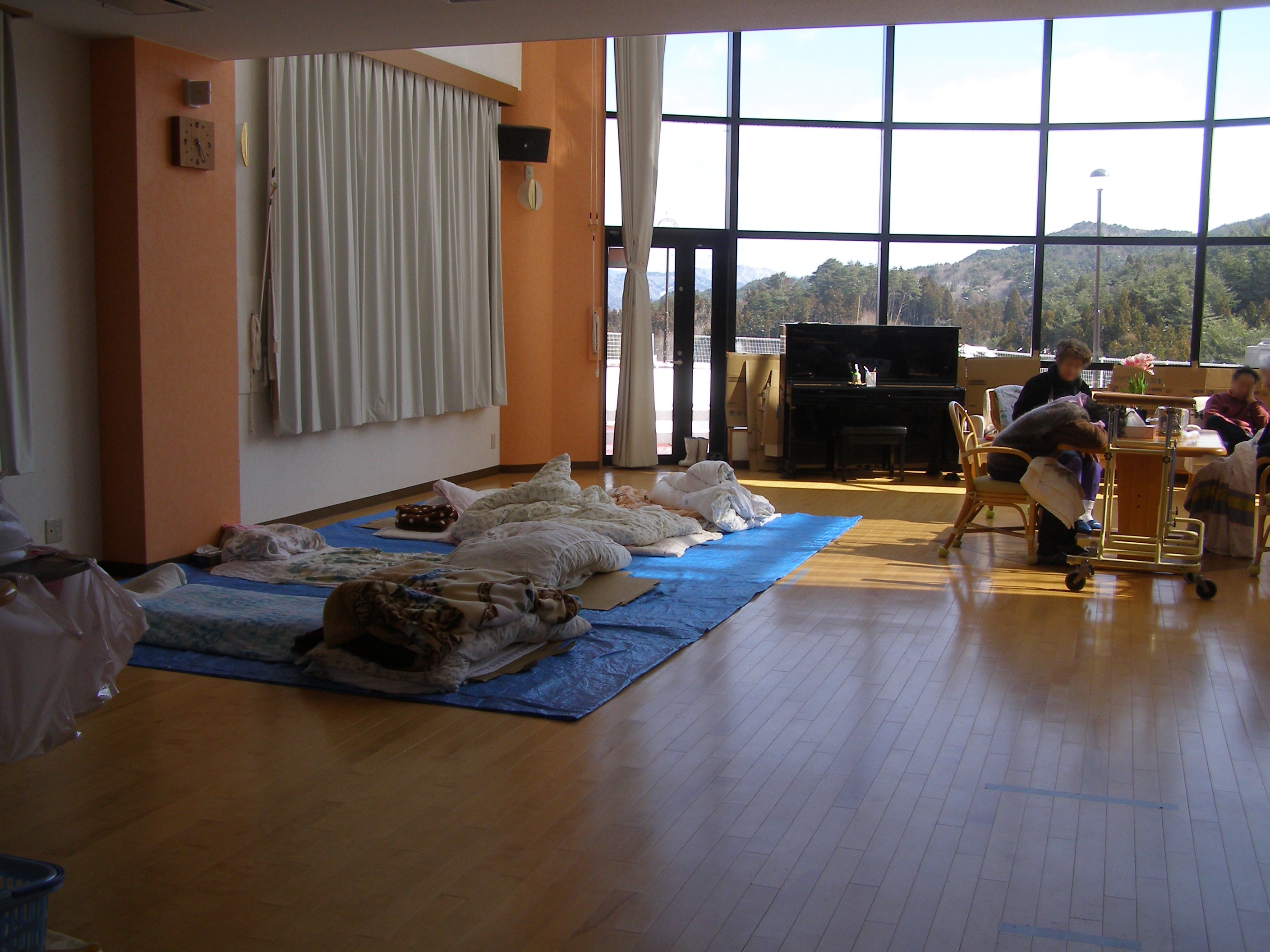 ホームでの避難生活。廊下でも、寝泊りがなされ、物品が置かれている。