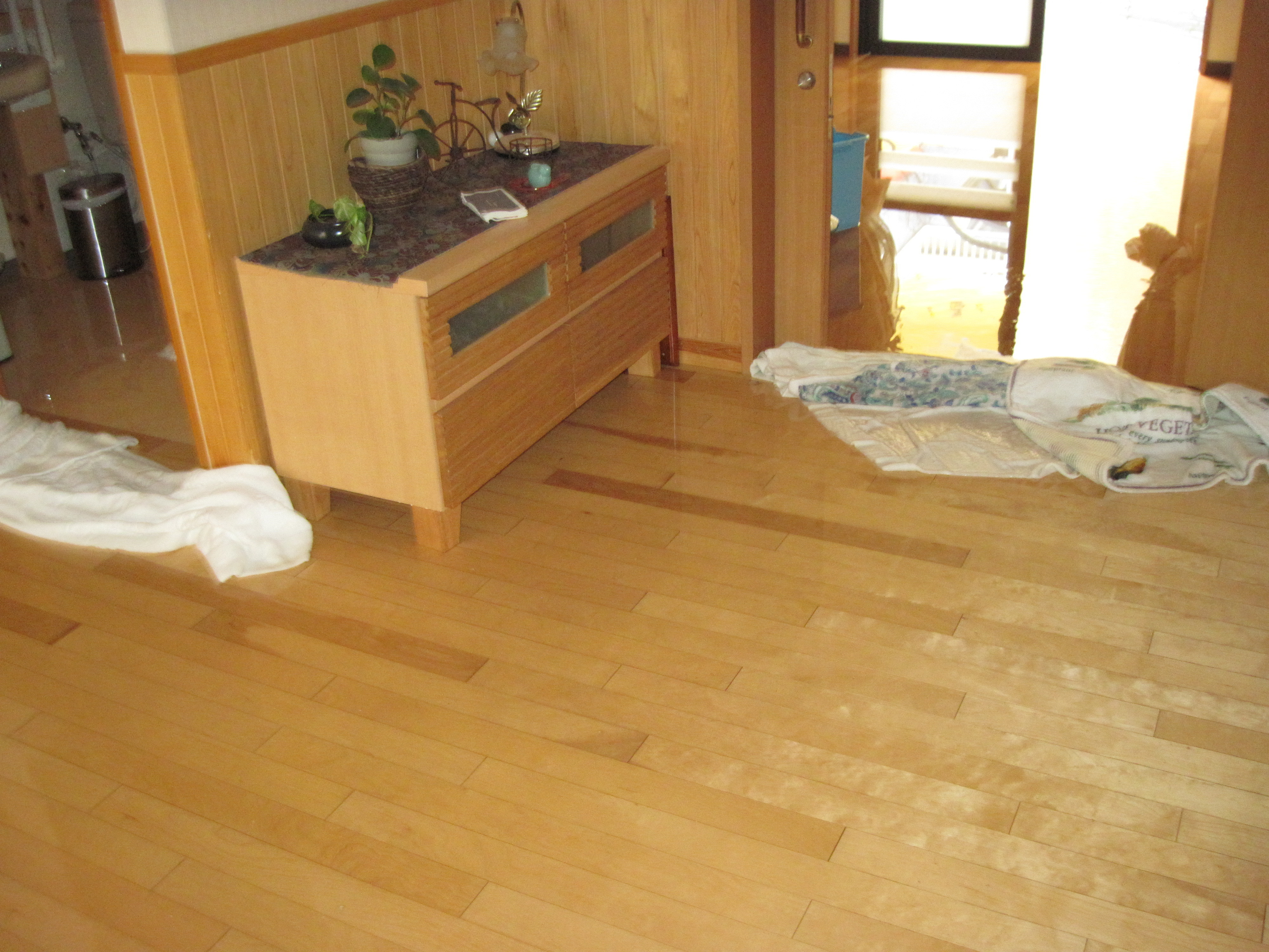 ホームでの避難生活。廊下でも、寝泊りがなされ、物品が置かれている。