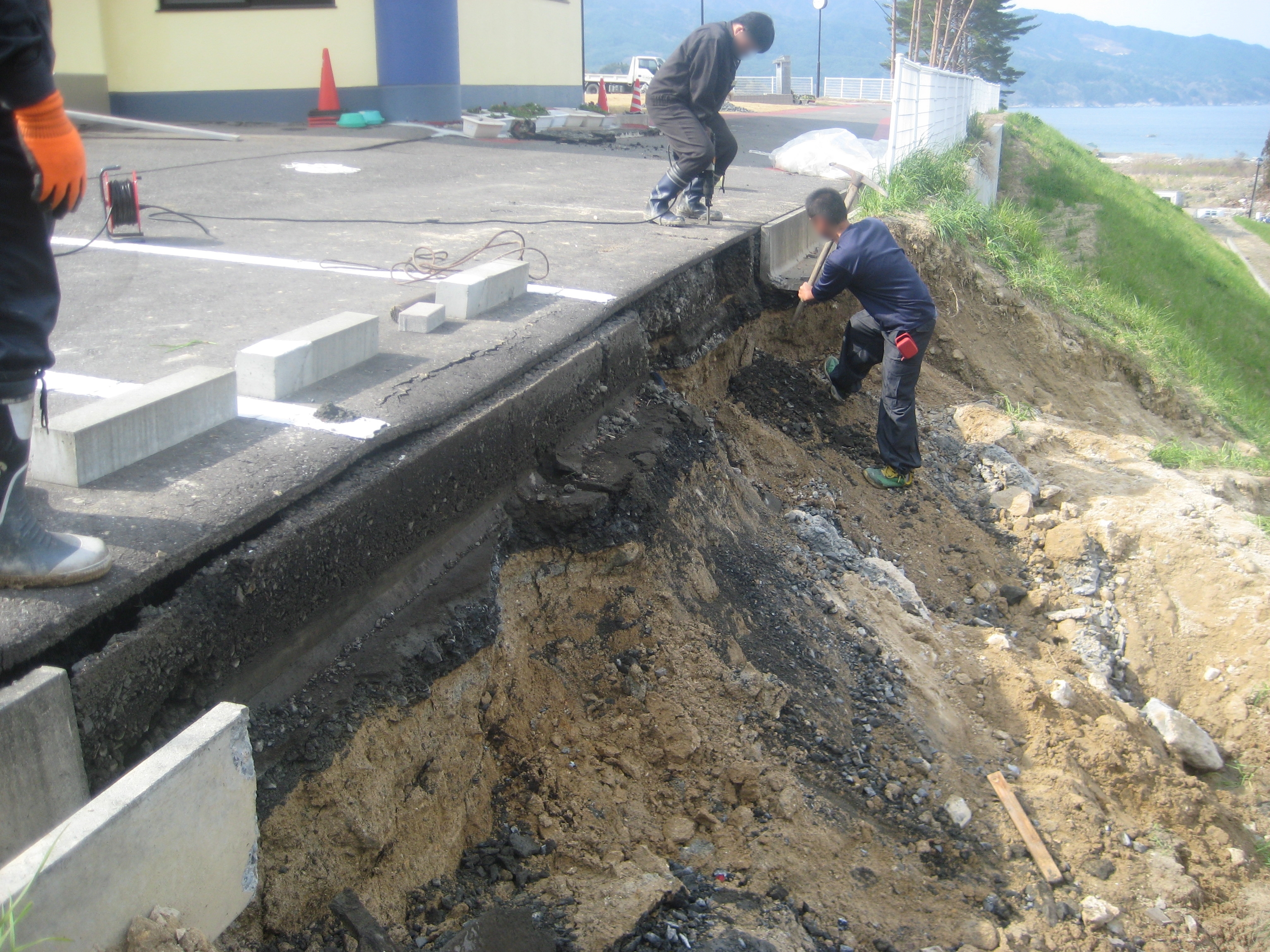 震災によるがけ崩れの被災状況と補修作業。