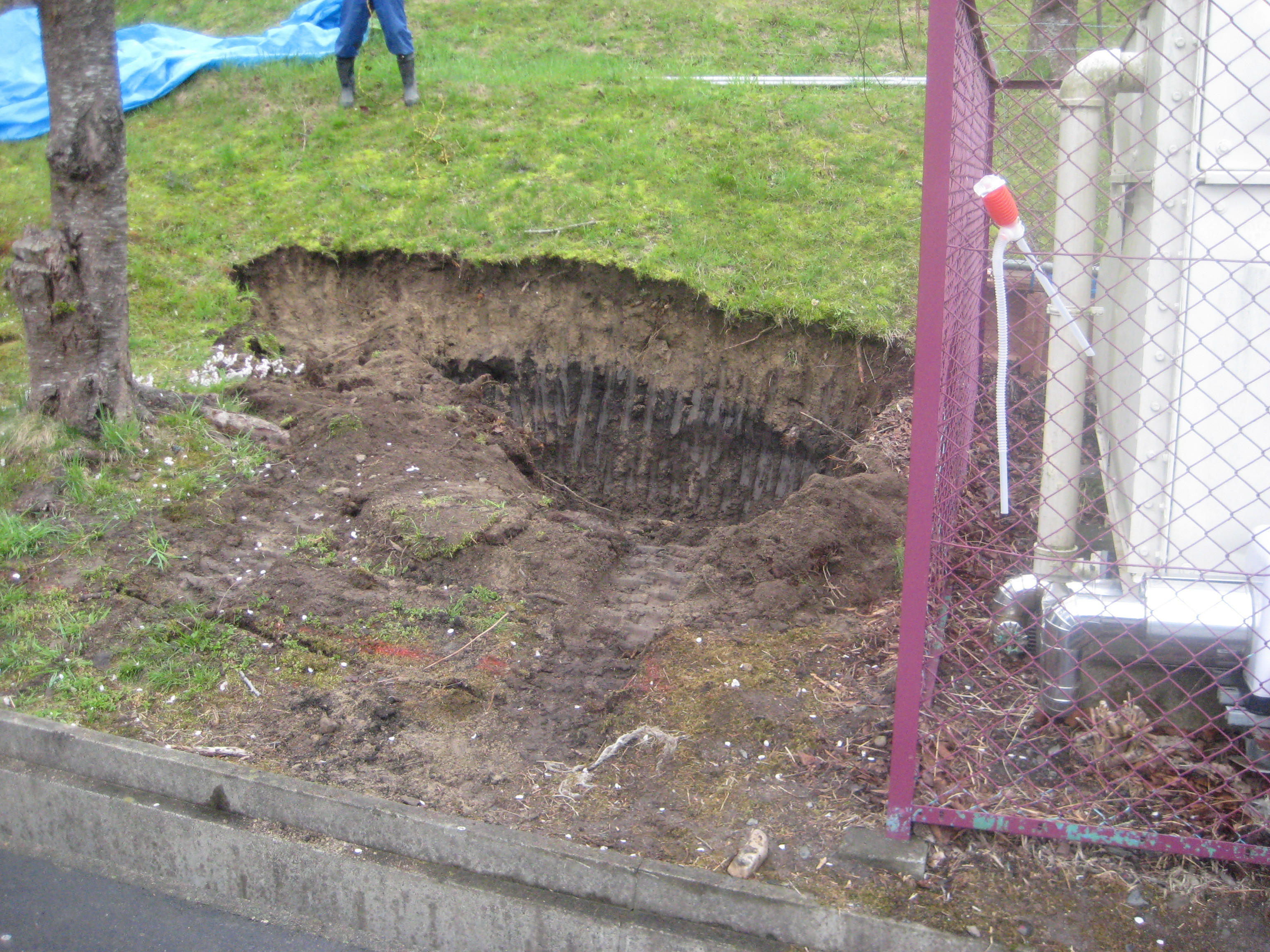 老人ホーム「らふたぁヒルズ」 芝生法面の崩れと舗装の亀裂、および修復。