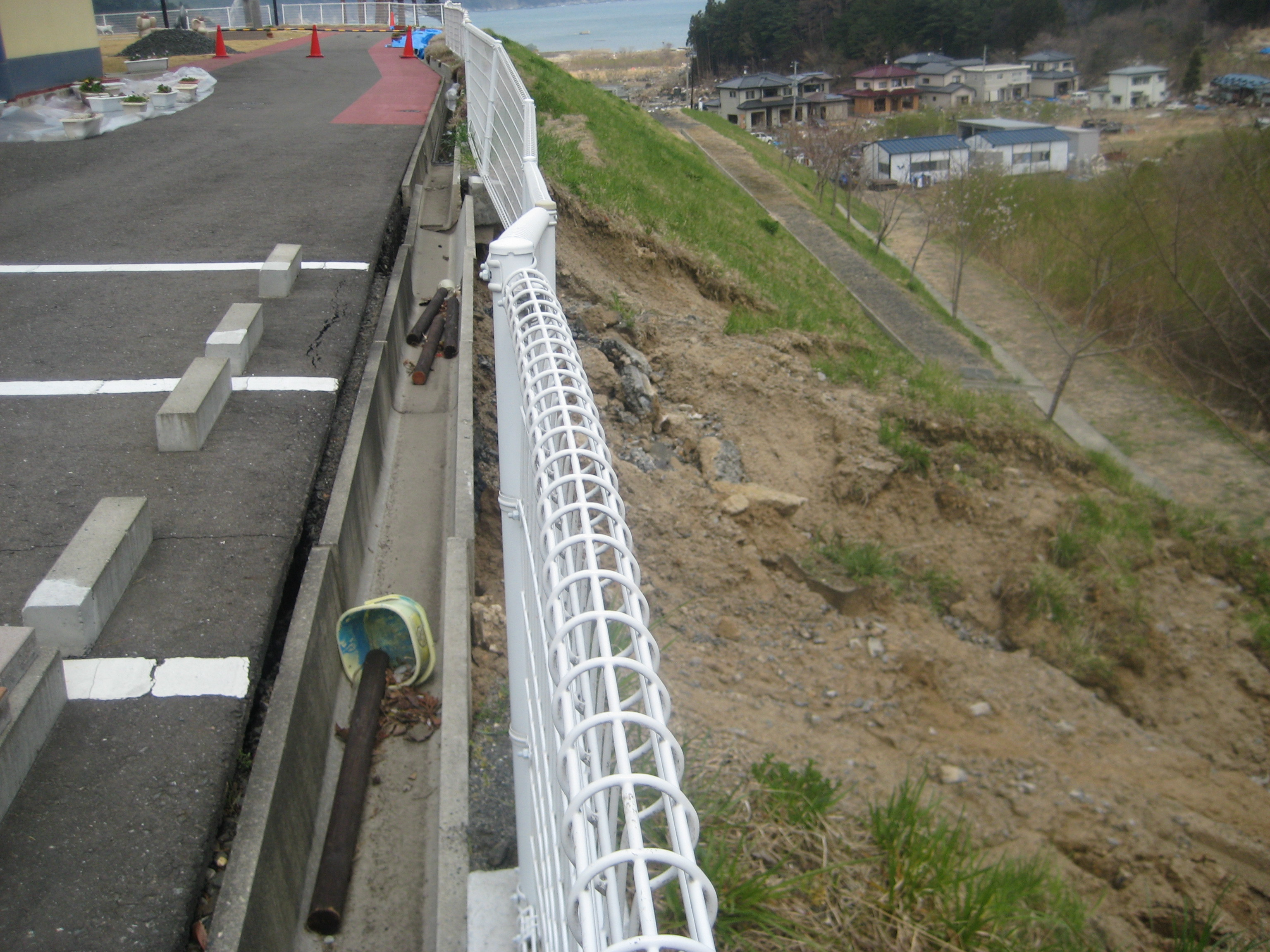 老人ホーム「らふたぁヒルズ」 芝生法面の崩れと舗装の亀裂、および修復。