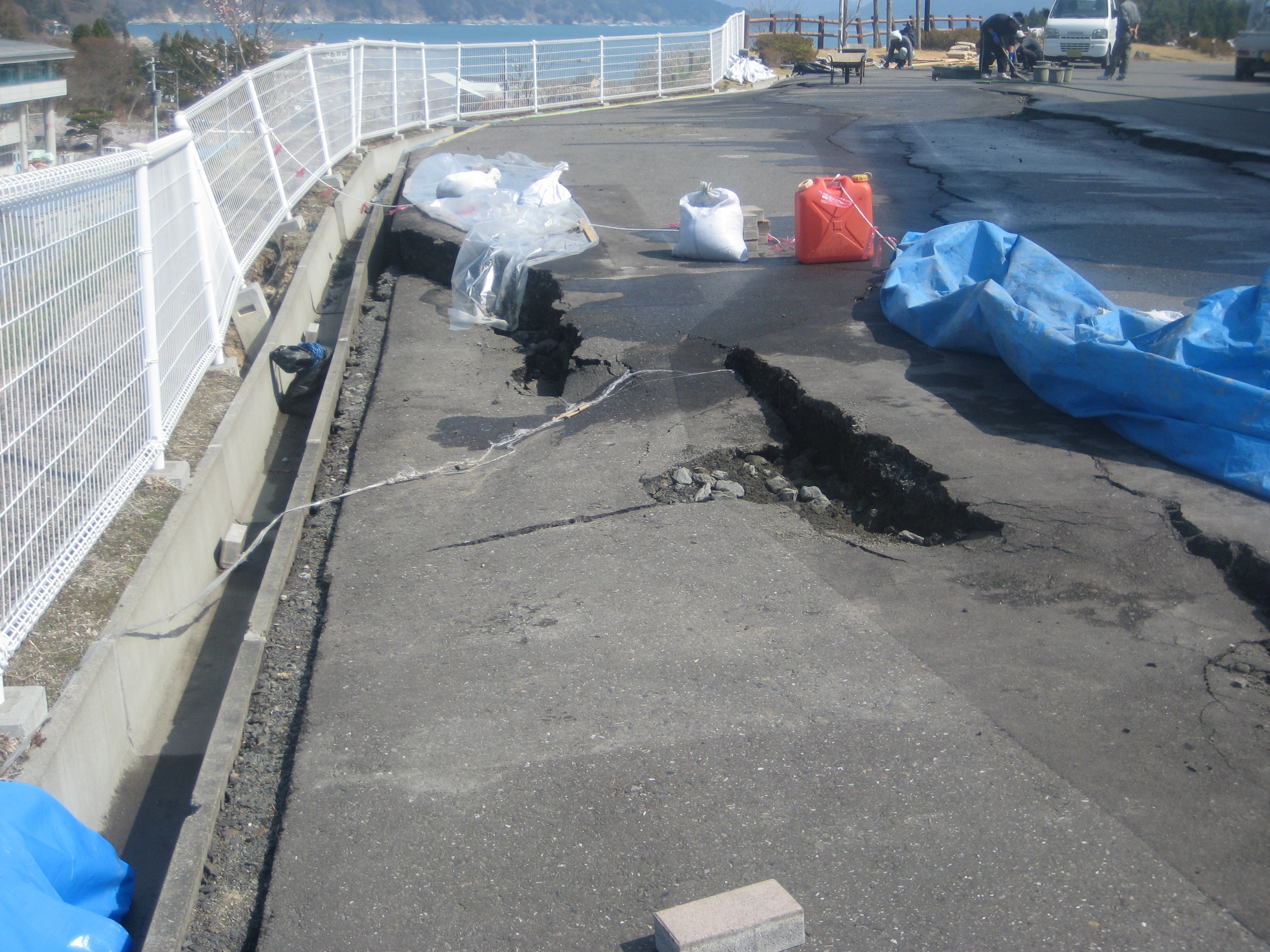 老人ホーム「らふたぁヒルズ」 芝生法面の崩れと舗装の亀裂、および修復。