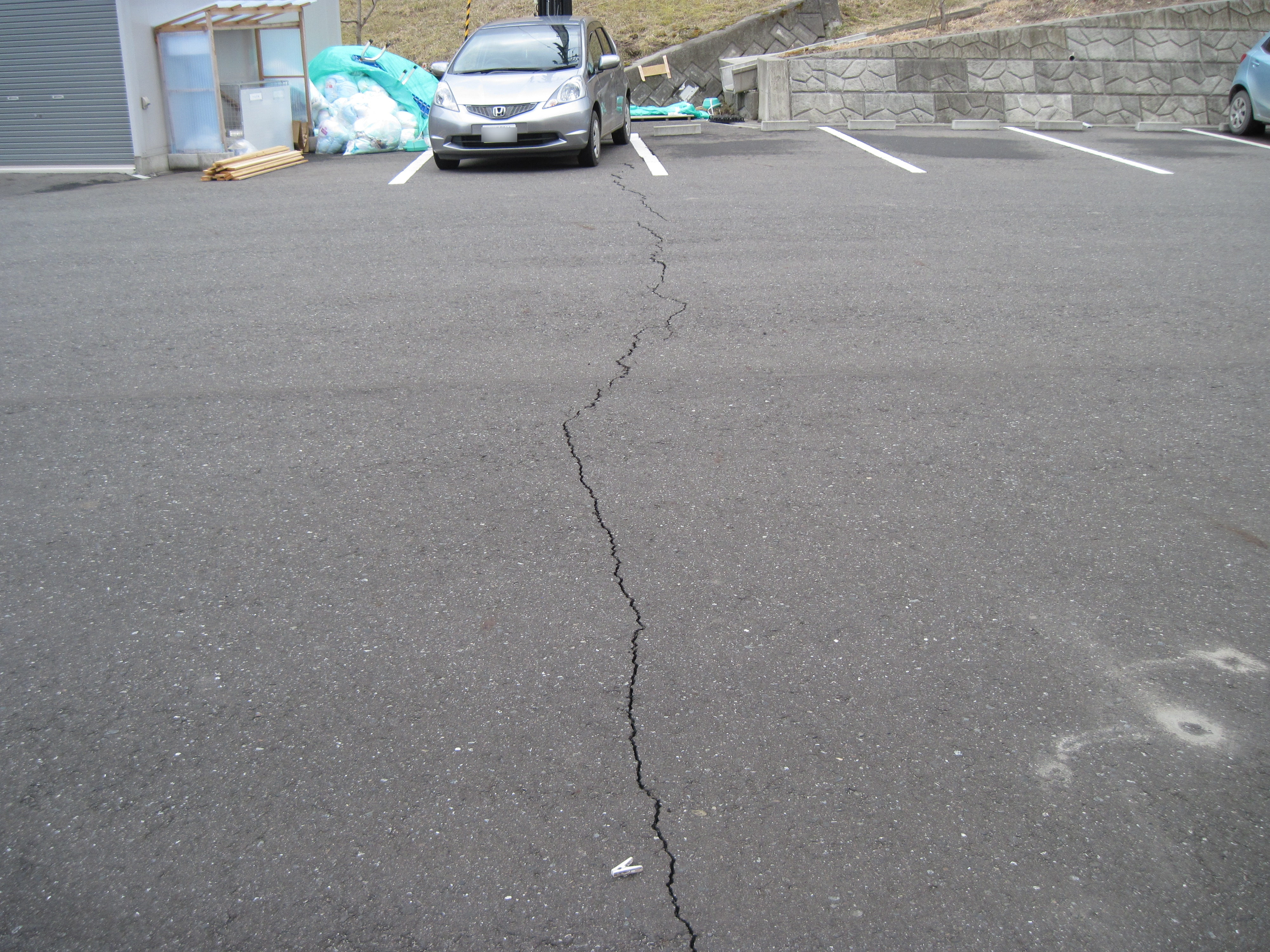 老人ホーム地割れ状況と修復作業(らふたぁヒルズ)