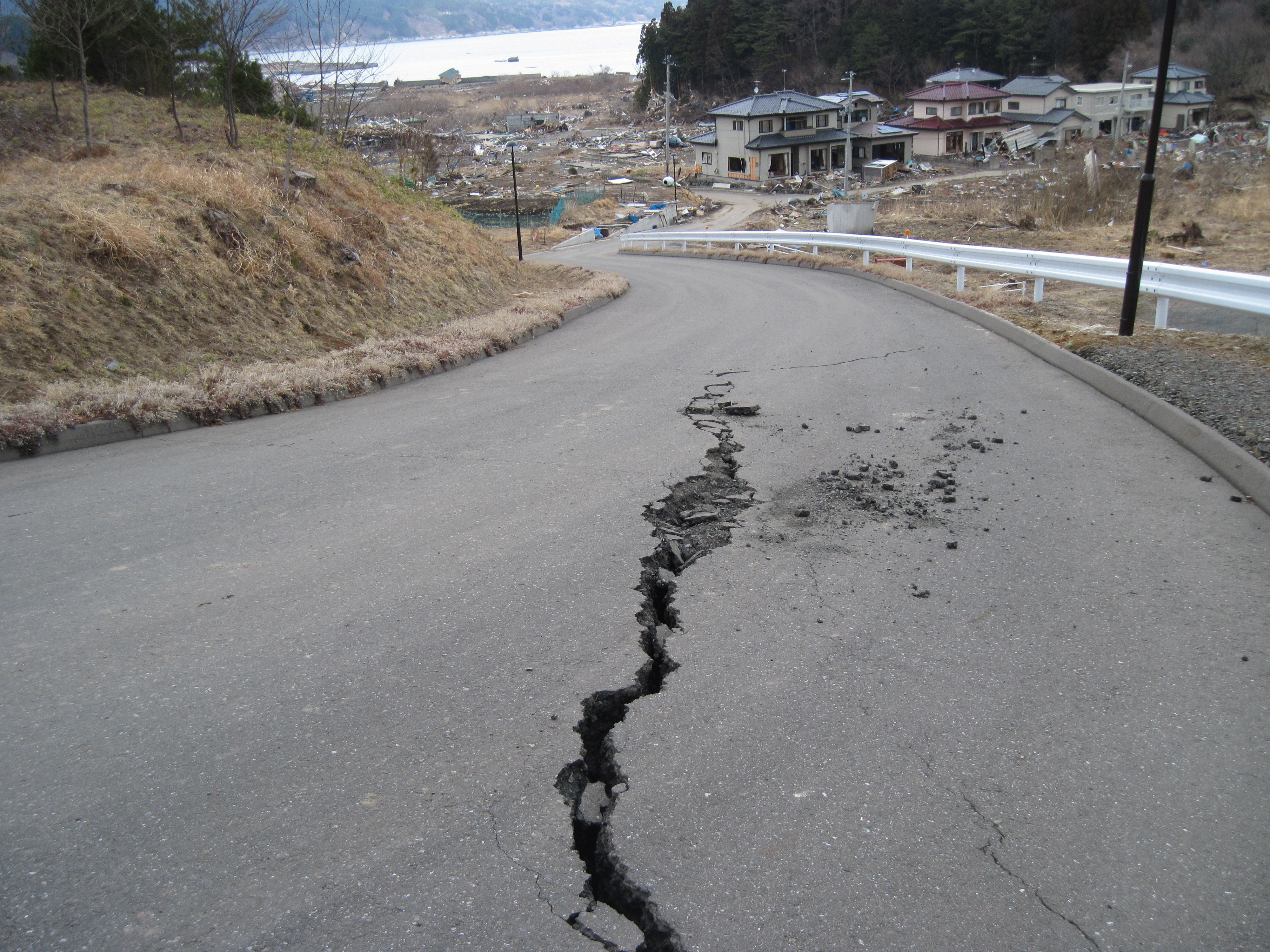 地盤沈下により老人ホームと地面の間にできた地割れ。