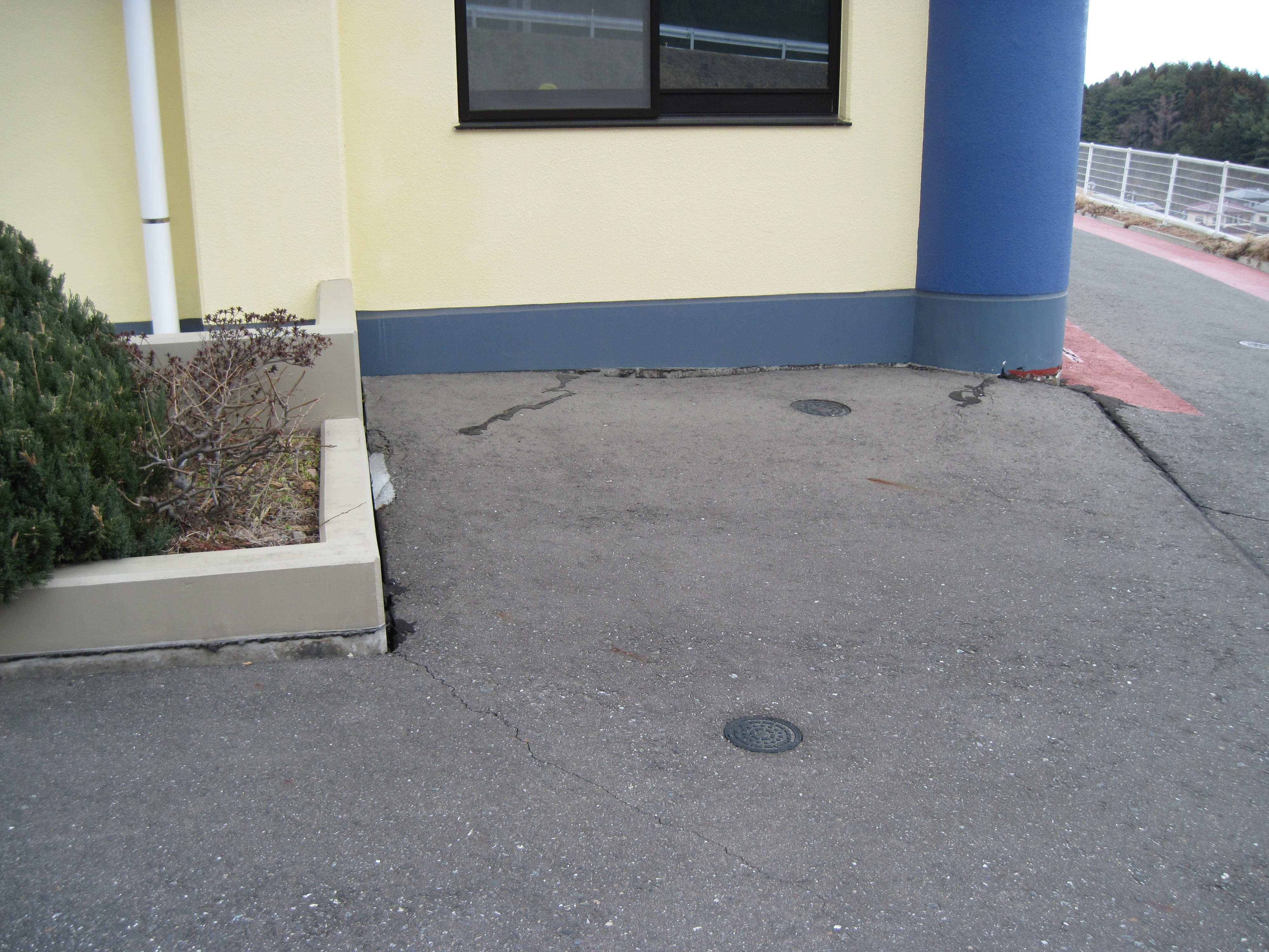 地盤沈下により老人ホームと地面の間にできた地割れ。