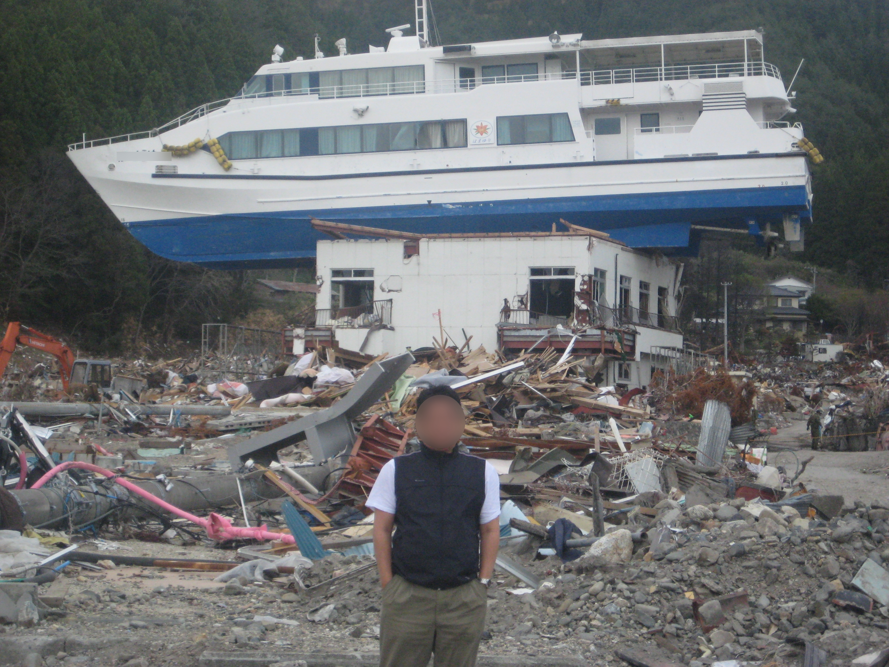 町内被災状況。赤浜の民宿「あかぶ」屋上にある、観光船「はまゆり」の画像含む。
