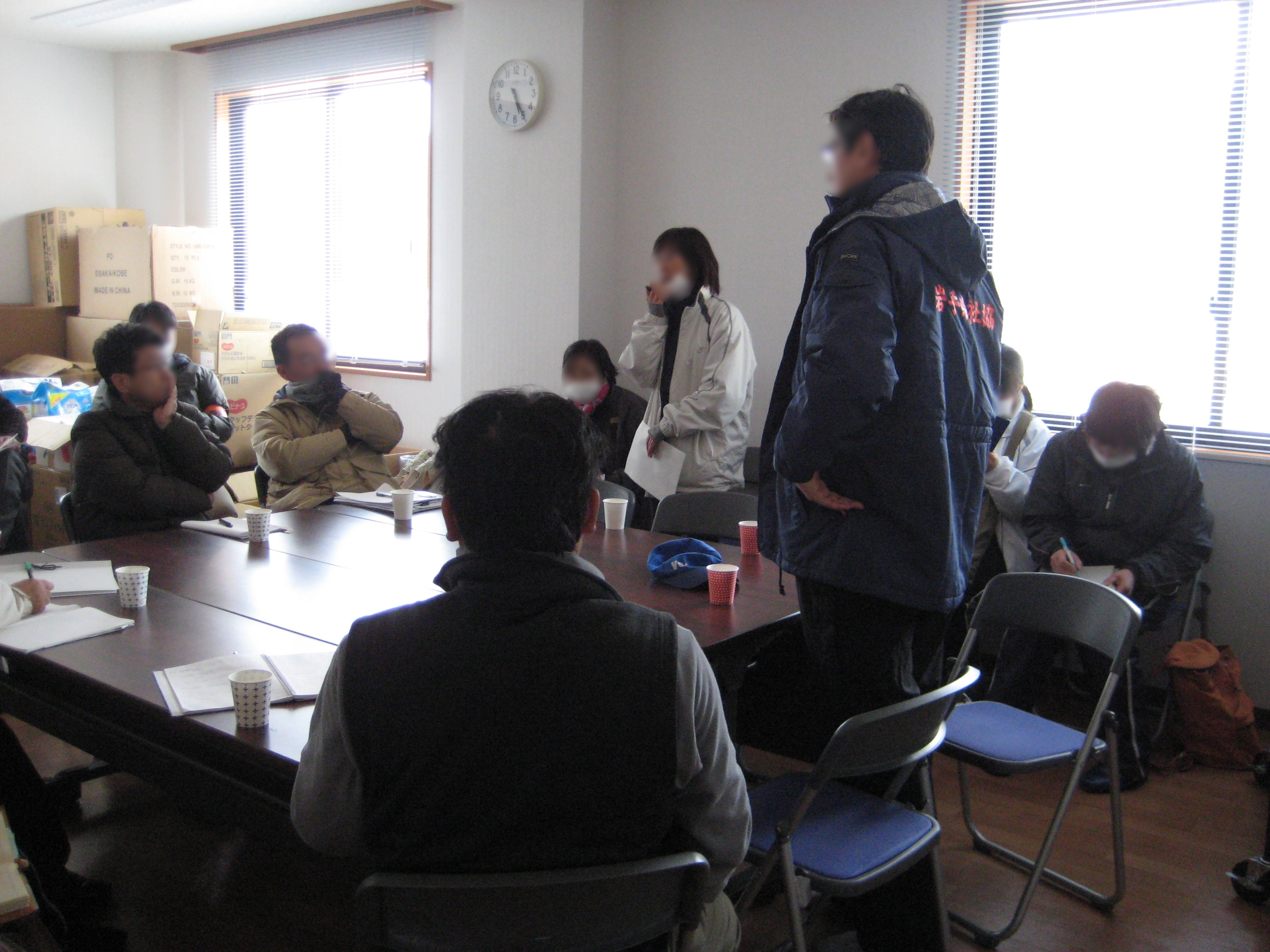 救援についての話し合い 拡大表示 ダウンロード 識別子 : 7461 タイトルよみ : キュウエンニツイテノハナシアイ 說明・要約 : メモを取りながら話し合っている 作成者(撮影者) : 社会福祉法人 堤福祉会 作成者(撮影者)よみ : シャカイフクシホウジン ツツミフクシカイ 提供者 : 社会福祉法人 堤福祉会 提供者よみ : シャカイフクシホウジン ツツミフクシカイ 撮影(作成)場所 : 岩手県上閉伊郡大槌町 撮影(作成)場所よみ : イワテケンカミヘイグンオオツチチョウ 作成日・撮影日 : 2011年 3月 22日 カテゴリー : 避難所 地域 : 吉里吉里地区 備考 : 一般公開