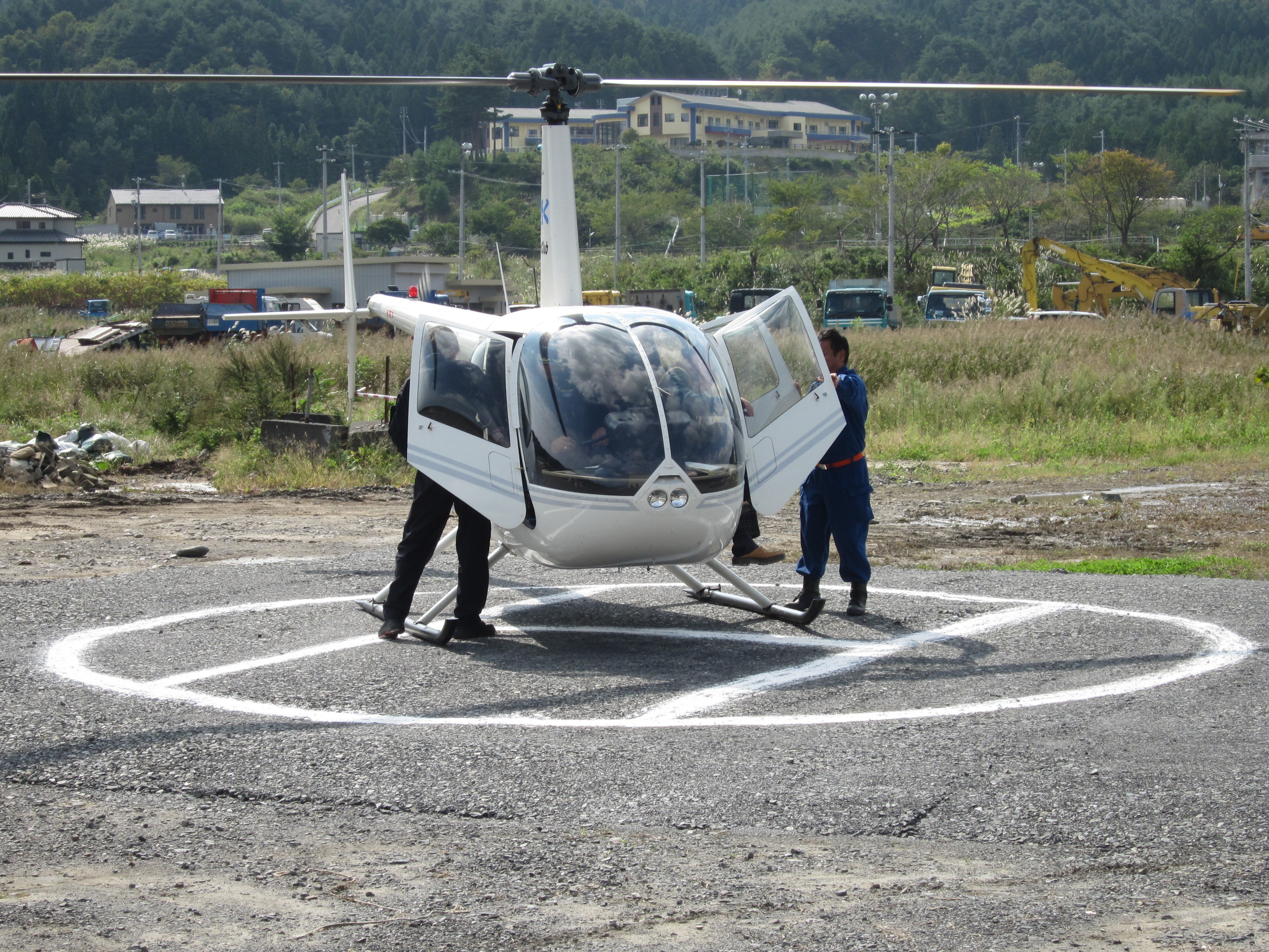 仮設へリポートに着陸をしたヘリコプターから降りてくる隊員。「らふたぁヒルズ」と吉里吉里中学校付近。