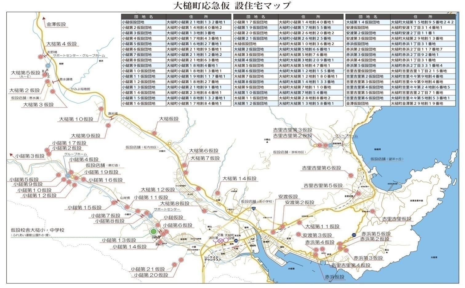 大槌町応急仮設住宅マップ 拡大表示 ダウンロード 識別子 : 15132 タイトルよみ : おおつちまちおうきゅうかせつじゅうたくまっぷ 說明・要約 : 平成25年4月現在の 大槌町応急仮設住宅マップです 作成者(撮影者) : 大槌町 作成者(撮影者)よみ : おおつちちょう 提供者 : 提供者よみ : 撮影(作成)場所 : 岩手県上閉伊郡大槌町 撮影(作成)場所よみ : イワテケンカミヘイグンオオツチチョウ 作成日・撮影日 : カテゴリー : 仮設住宅 くらし・文化 地域 : その他 備考 : 大槌町応急仮設住宅マップ(平成25年4月現在) 震災事象 住民(住居:避難所~仮設住宅~災害公営住宅) > 避難所から仮設住宅へ > 大槌町応急仮設住宅マップ