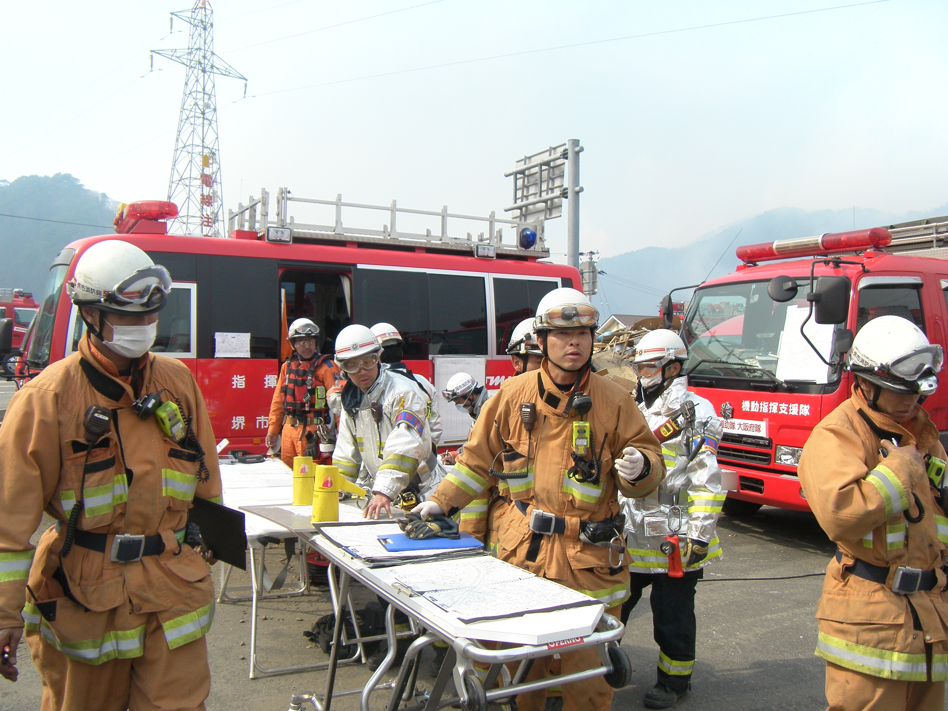 捜索活動の様子 拡大表示 ダウンロード 識別子 : 646 タイトルよみ : ソウサクカツドウノヨウス 說明・要約 : 図面を見ながら打合せをしている消防隊員の様子 作成者(撮影者) : 堺市消防局 作成者(撮影者)よみ : サカイシショウボウキョク 提供者 : 堺市消防局 提供者よみ : サカイシショウボウキョク 撮影(作成)場所 : 岩手県上閉伊郡大槌町 花輪田 撮影(作成)場所よみ : イワテケンカミヘイグンオオツチチョウ ハナワダ 作成日・撮影日 : 2011年 3月 14日 カテゴリー : 捜索 地域 : 桜木町・花輪田地区 備考 : 堺市消防局提供 震災事象 行政の執行 > 本部体制の強化 > 【防災関係機関(応援部隊)の支援】ご遺体の捜索から搬送、災害医療、消火活動、避難生活支援、物資搬送等、多岐に渡った。県から職員派遣等の対応があった。