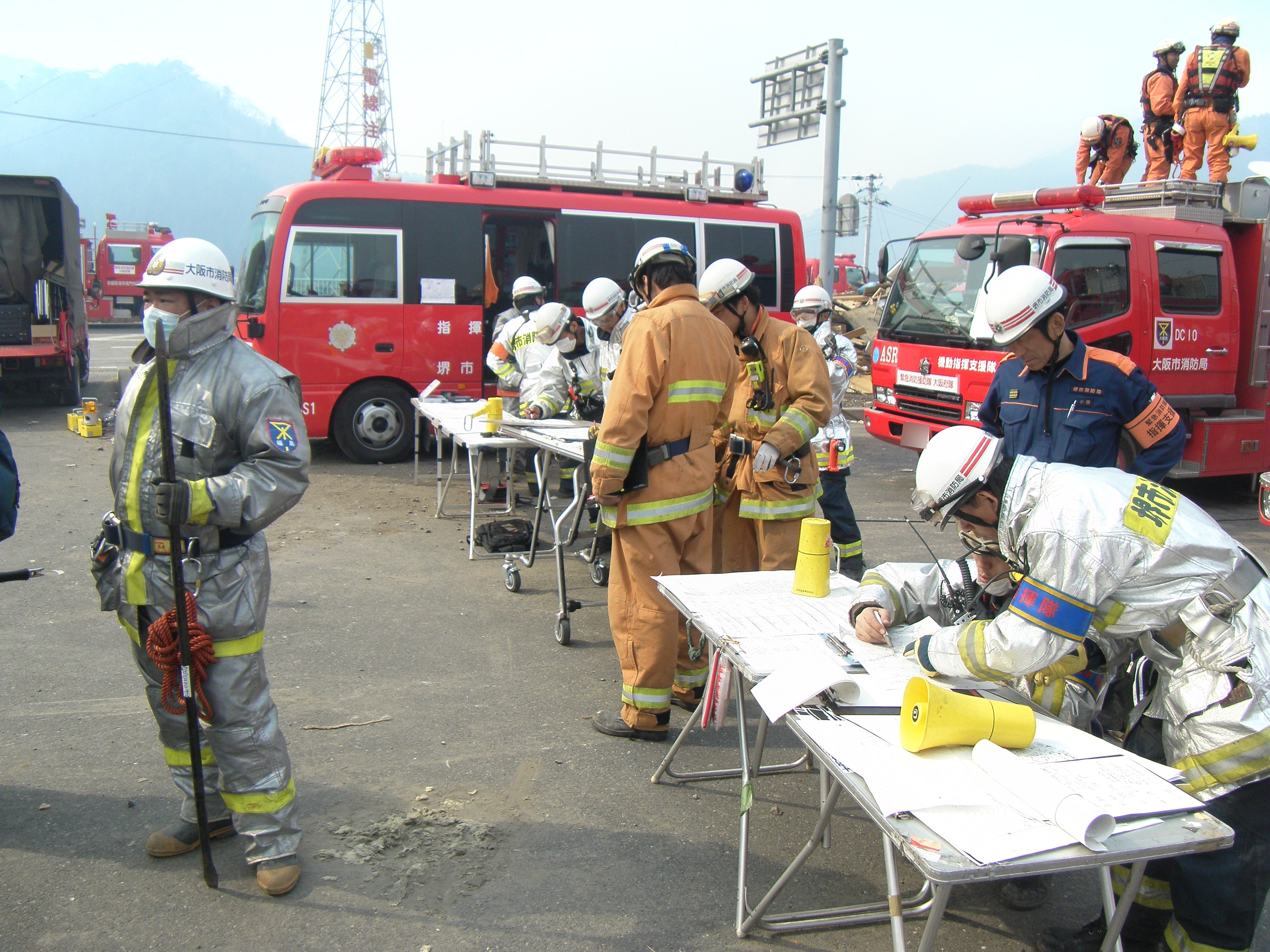 捜索活動の様子 拡大表示 ダウンロード 識別子 : 648 タイトルよみ : ソウサクカツドウノヨウス 說明・要約 : 図面を見ながら打合せをしている消防隊員の様子 作成者(撮影者) : 堺市消防局 作成者(撮影者)よみ : サカイシショウボウキョク 提供者 : 堺市消防局 提供者よみ : サカイシショウボウキョク 撮影(作成)場所 : 岩手県上閉伊郡大槌町 花輪田 撮影(作成)場所よみ : イワテケンカミヘイグンオオツチチョウ ハナワダ 作成日・撮影日 : 2011年 3月 14日 カテゴリー : 捜索 地域 : 桜木町・花輪田地区 備考 : 堺市消防局提供 震災事象 行政の執行 > 本部体制の強化 > 【防災関係機関(応援部隊)の支援】ご遺体の捜索から搬送、災害医療、消火活動、避難生活支援、物資搬送等、多岐に渡った。県から職員派遣等の対応があった。