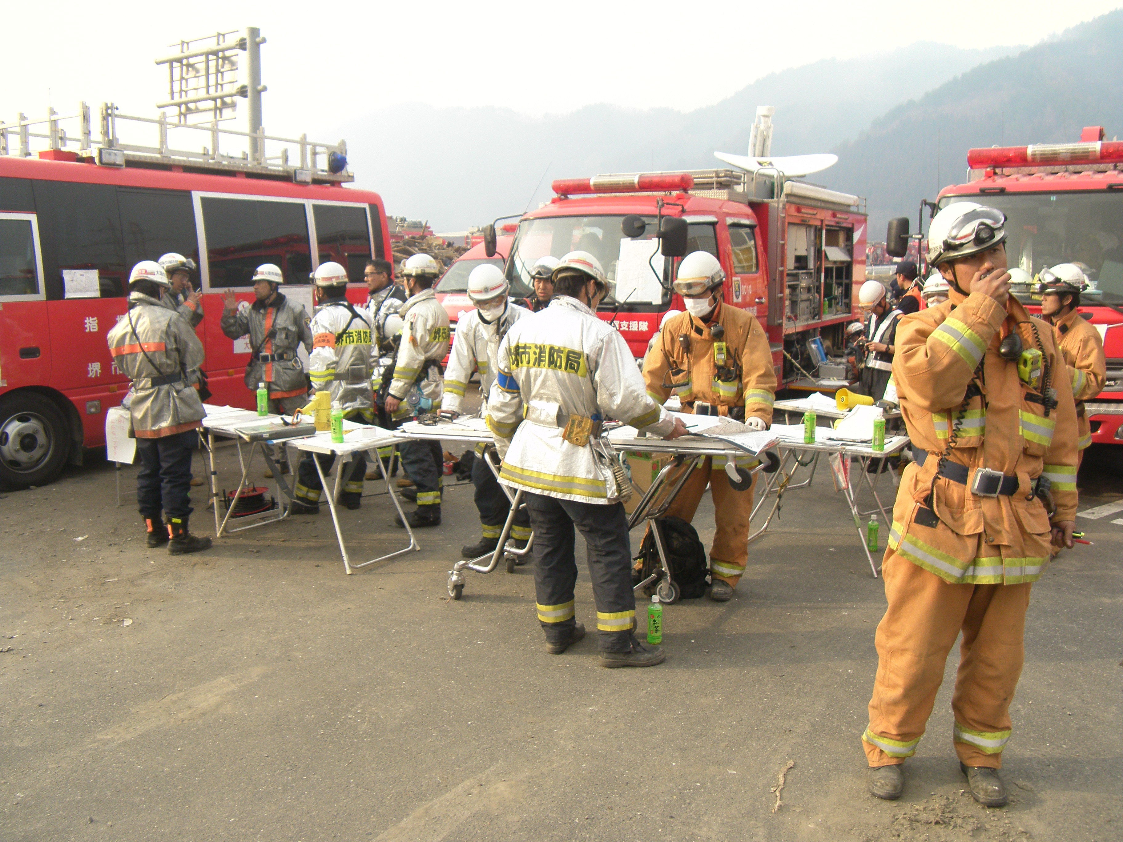 捜索活動の様子 拡大表示 ダウンロード 識別子 : 652 タイトルよみ : ソウサクカツドウノヨウス 說明・要約 : 図面を見ながら打合せをしている消防隊員の様子 作成者(撮影者) : 堺市消防局 作成者(撮影者)よみ : サカイシショウボウキョク 提供者 : 堺市消防局 提供者よみ : サカイシショウボウキョク 撮影(作成)場所 : 岩手県上閉伊郡大槌町 花輪田 撮影(作成)場所よみ : イワテケンカミヘイグンオオツチチョウ ハナワダ 作成日・撮影日 : 2011年 3月 14日 カテゴリー : 捜索 地域 : 桜木町・花輪田地区 備考 : 堺市消防局提供 震災事象 行政の執行 > 本部体制の強化 > 【防災関係機関(応援部隊)の支援】ご遺体の捜索から搬送、災害医療、消火活動、避難生活支援、物資搬送等、多岐に渡った。県から職員派遣等の対応があった。