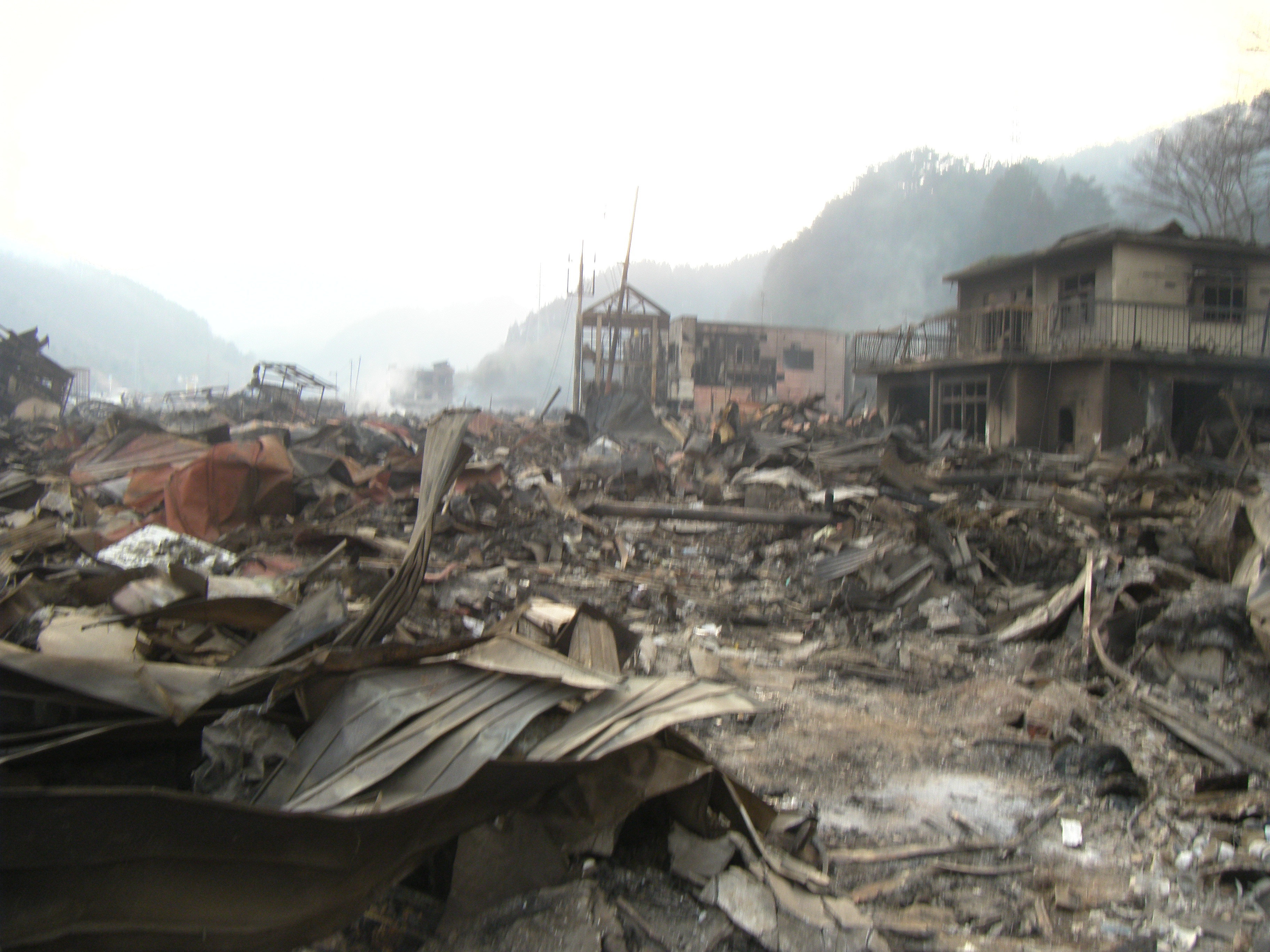 被災状況 拡大表示 ダウンロード 識別子 : 667 タイトルよみ : ヒサイジョウキョウ 說明・要約 : 火災にあった建物と焼け焦げたガレキが散乱している様子 作成者(撮影者) : 堺市消防局 作成者(撮影者)よみ : サカイシショウボウキョク 提供者 : 堺市消防局 提供者よみ : サカイシショウボウキョク 撮影(作成)場所 : 岩手県上閉伊郡大槌町 上町 撮影(作成)場所よみ : イワテケンカミヘイグンオオツチチョウ カミチョウ 作成日・撮影日 : 2011年 3月 14日 カテゴリー : 物的被害 地域 : 町方地区 備考 : 堺市消防局提供 震災事象 行政の執行 > 本部体制の強化 > 【防災関係機関(応援部隊)の支援】ご遺体の捜索から搬送、災害医療、消火活動、避難生活支援、物資搬送等、多岐に渡った。県から職員派遣等の対応があった。