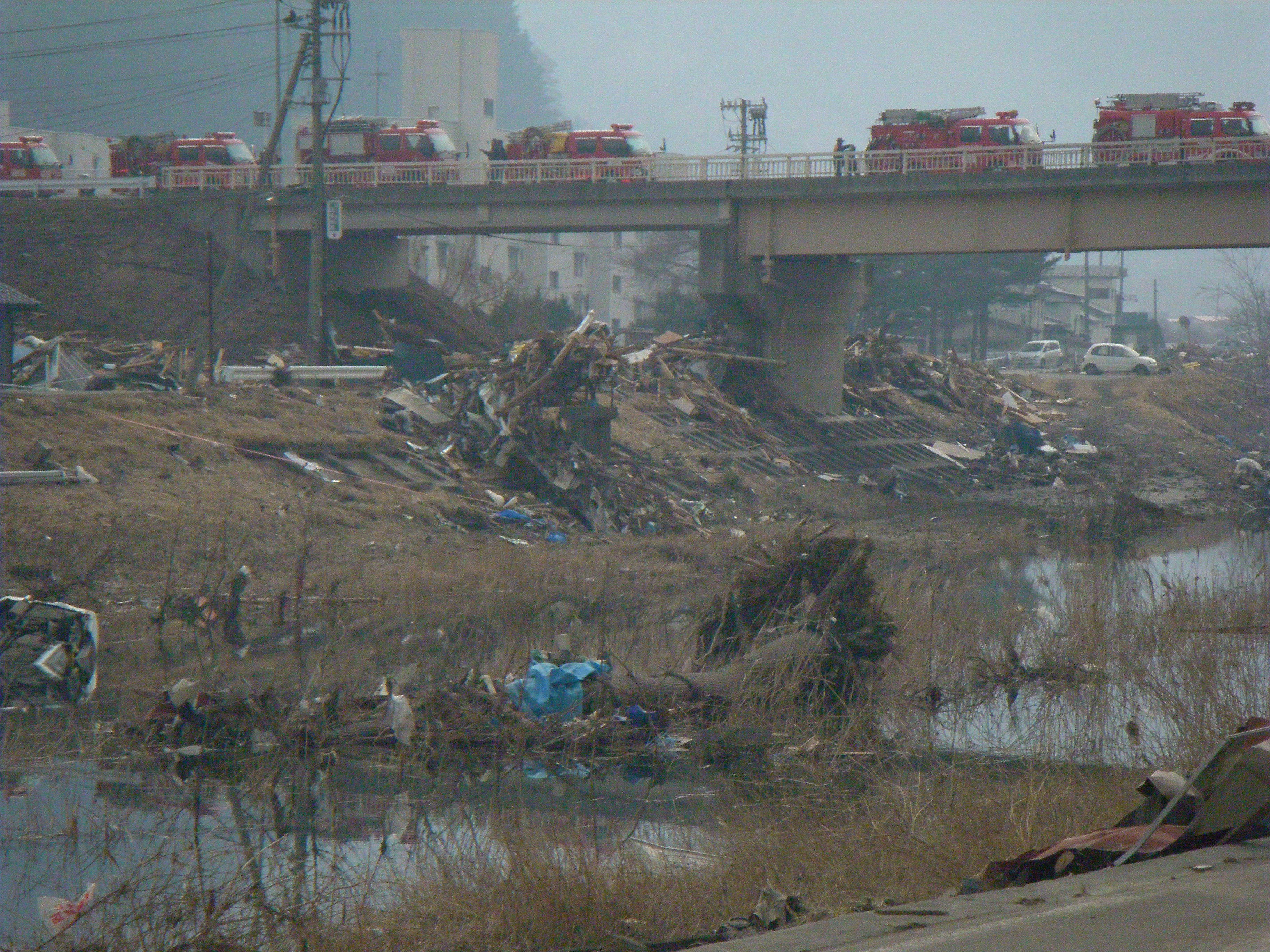 捜索活動の様子 拡大表示 ダウンロード 識別子 : 673 タイトルよみ : ソウサクカツドウノヨウス 說明・要約 : 橋の上で隊列を組んで駐車している消防車両 作成者(撮影者) : 堺市消防局 作成者(撮影者)よみ : サカイシショウボウキョク 提供者 : 堺市消防局 提供者よみ : サカイシショウボウキョク 撮影(作成)場所 : 岩手県上閉伊郡大槌町 撮影(作成)場所よみ : イワテケンカミヘイグンオオツチチョウ 作成日・撮影日 : 2011年 3月 14日 カテゴリー : 捜索 地域 : 桜木町・花輪田地区 備考 : 堺市消防局提供 震災事象 行政の執行 > 本部体制の強化 > 【防災関係機関(応援部隊)の支援】ご遺体の捜索から搬送、災害医療、消火活動、避難生活支援、物資搬送等、多岐に渡った。県から職員派遣等の対応があった。