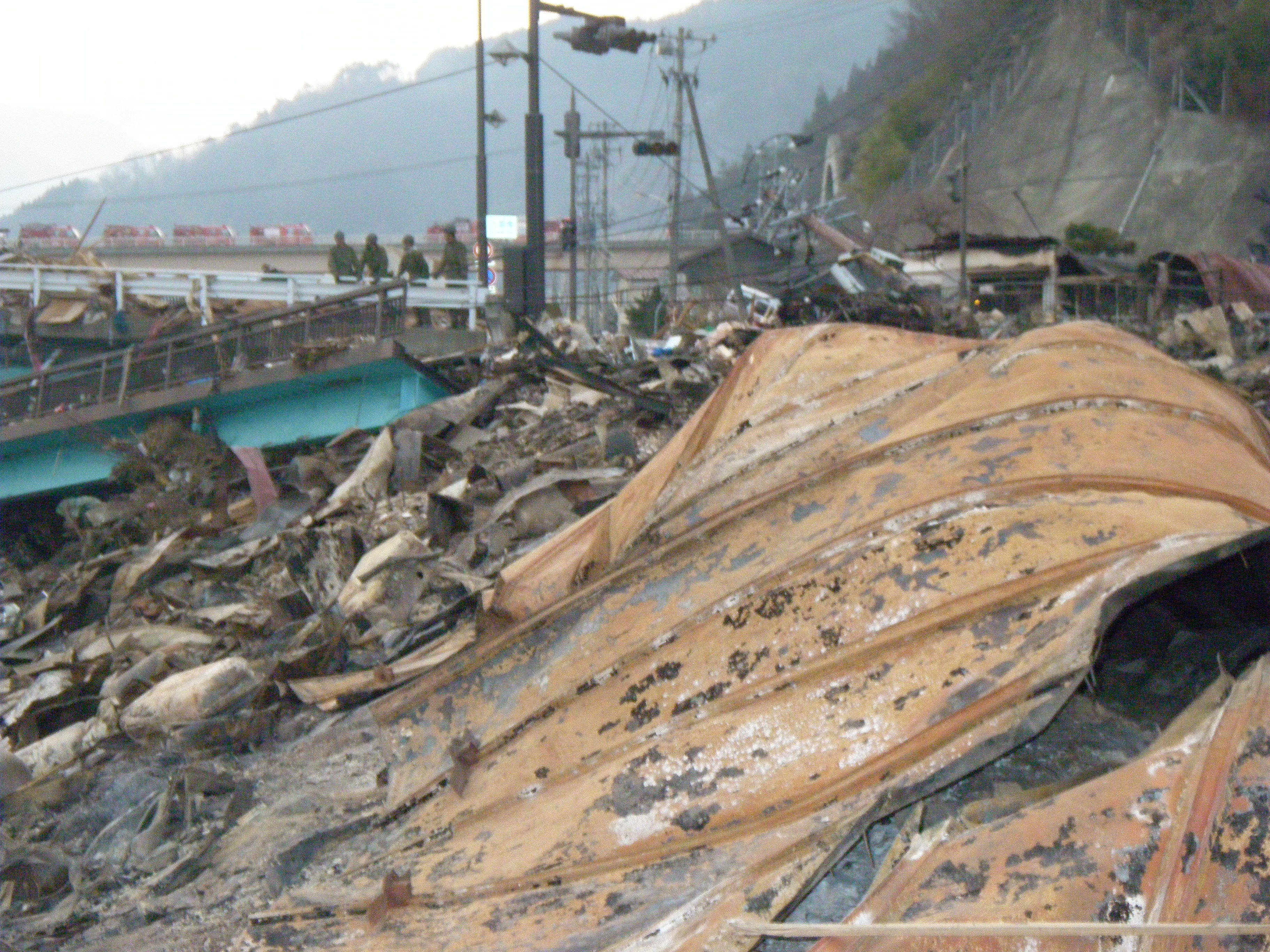 捜索活動の様子 拡大表示 ダウンロード 識別子 : 685 タイトルよみ : ソウサクカツドウノヨウス 說明・要約 : 橋の上の自衛隊員の様子 作成者(撮影者) : 堺市消防局 作成者(撮影者)よみ : サカイシショウボウキョク 提供者 : 堺市消防局 提供者よみ : サカイシショウボウキョク 撮影(作成)場所 : 岩手県上閉伊郡大槌町 撮影(作成)場所よみ : イワテケンカミヘイグンオオツチチョウ 作成日・撮影日 : 2011年 3月 14日 カテゴリー : 捜索活動 地域 : 桜木町・花輪田地区 備考 : 堺市消防局提供 震災事象 行政の執行 > 本部体制の強化 > 【防災関係機関(応援部隊)の支援】ご遺体の捜索から搬送、災害医療、消火活動、避難生活支援、物資搬送等、多岐に渡った。県から職員派遣等の対応があった。