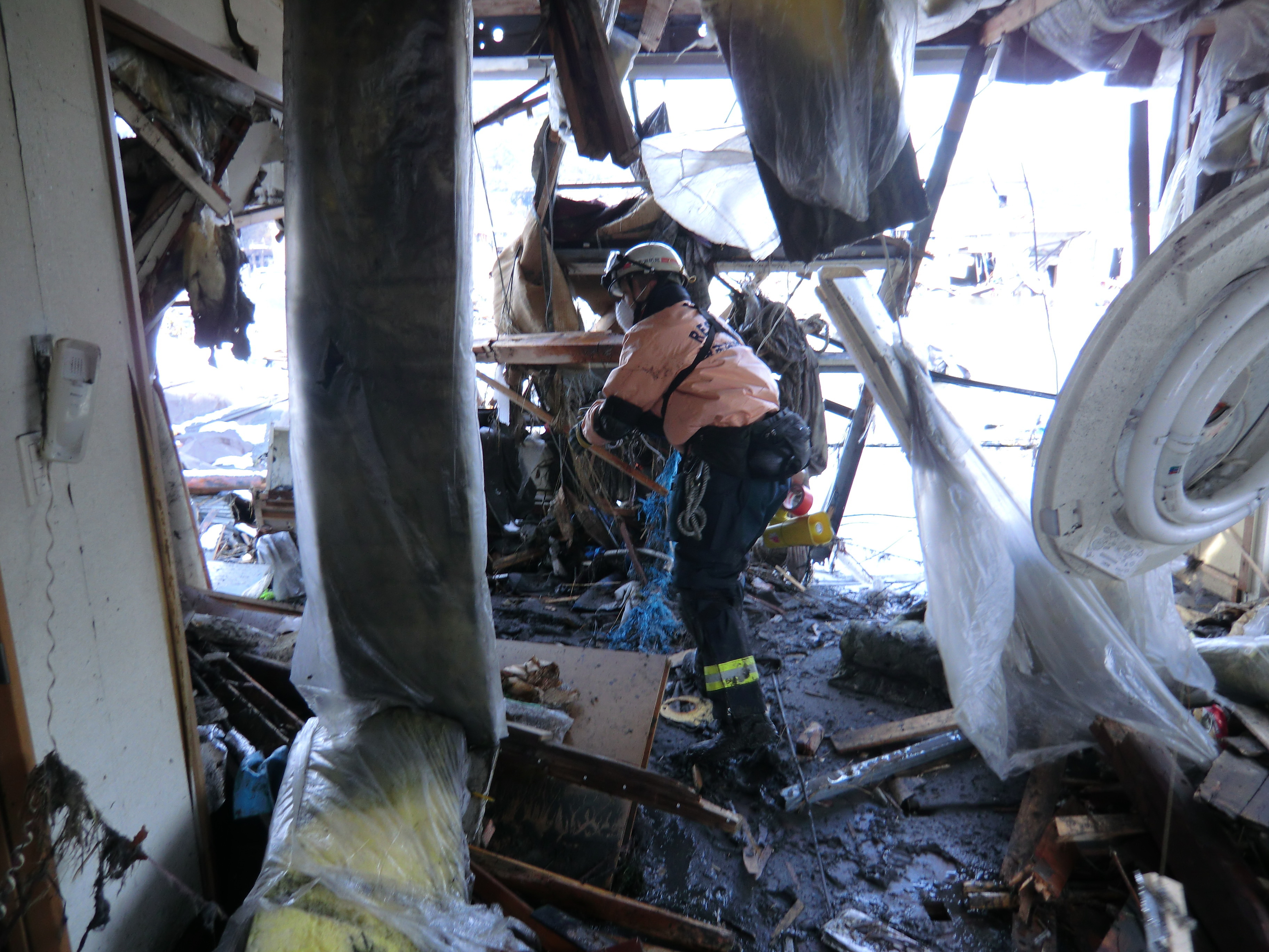 捜索活動の様子 拡大表示 ダウンロード 識別子 : 709 タイトルよみ : ソウサクカツドウノヨウス 說明・要約 : 被災した建物の中で捜索活動をしている消防隊員の様子 作成者(撮影者) : 堺市消防局 作成者(撮影者)よみ : サカイシショウボウキョク 提供者 : 堺市消防局 提供者よみ : サカイシショウボウキョク 撮影(作成)場所 : 岩手県上閉伊郡大槌町 大槌町 撮影(作成)場所よみ : イワテケンカミヘイグンオオツチチョウ オオツチチョウ 作成日・撮影日 : 2011年 3月 16日 カテゴリー : 捜索 地域 : その他 備考 : 堺市消防局提供 震災事象 行政の執行 > 本部体制の強化 > 【防災関係機関(応援部隊)の支援】ご遺体の捜索から搬送、災害医療、消火活動、避難生活支援、物資搬送等、多岐に渡った。県から職員派遣等の対応があった。