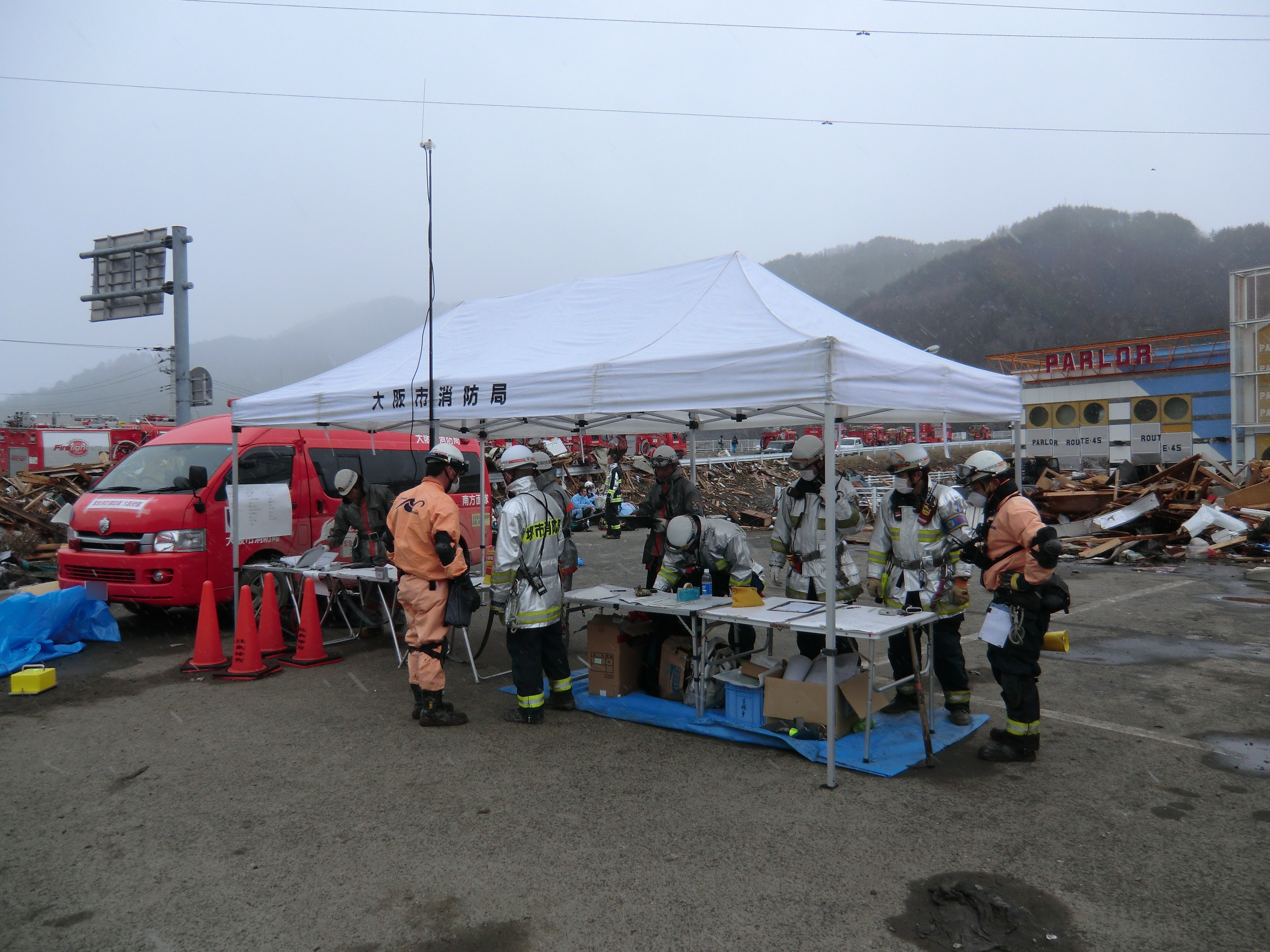 捜索活動の様子 拡大表示 ダウンロード 識別子 : 753 タイトルよみ : ソウサクカツドウノヨウス 說明・要約 : 駐車場に設置された消防本部の様子 作成者(撮影者) : 堺市消防局 作成者(撮影者)よみ : サカイシショウボウキョク 提供者 : 堺市消防局 提供者よみ : サカイシショウボウキョク 撮影(作成)場所 : 岩手県上閉伊郡大槌町 花輪田 撮影(作成)場所よみ : イワテケンカミヘイグンオオツチチョウ ハナワダ 作成日・撮影日 : 2011年 3月 16日 カテゴリー : 捜索 地域 : 桜木町・花輪田地区 備考 : 堺市消防局提供 震災事象 行政の執行 > 本部体制の強化 > 【防災関係機関(応援部隊)の支援】ご遺体の捜索から搬送、災害医療、消火活動、避難生活支援、物資搬送等、多岐に渡った。県から職員派遣等の対応があった。