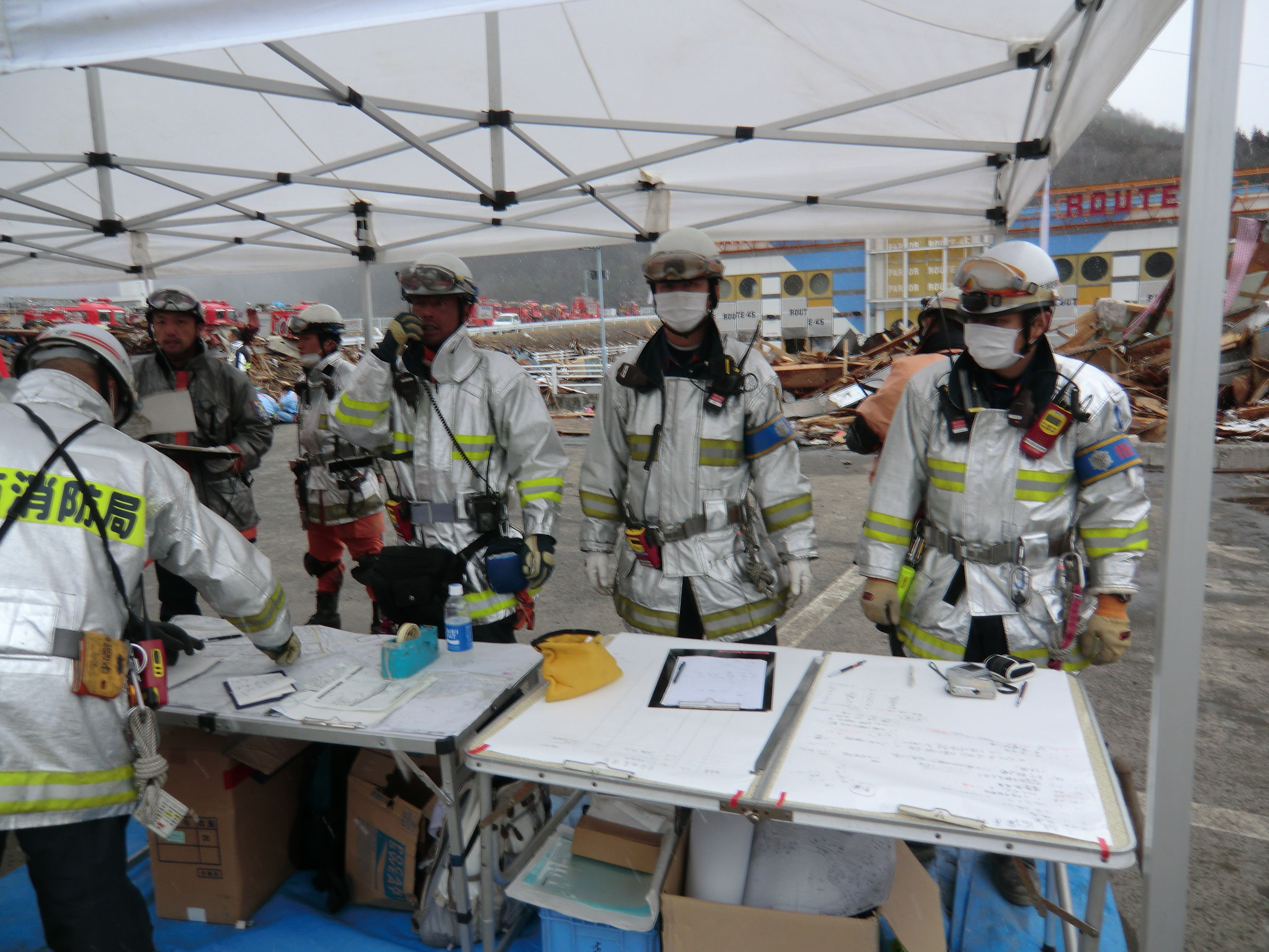 捜索活動の様子 拡大表示 ダウンロード 識別子 : 755 タイトルよみ : ソウサクカツドウノヨウス 說明・要約 : 駐車場に設置された消防本部の様子 作成者(撮影者) : 堺市消防局 作成者(撮影者)よみ : サカイシショウボウキョク 提供者 : 堺市消防局 提供者よみ : サカイシショウボウキョク 撮影(作成)場所 : 岩手県上閉伊郡大槌町 花輪田 撮影(作成)場所よみ : イワテケンカミヘイグンオオツチチョウ ハナワダ 作成日・撮影日 : 2011年 3月 16日 カテゴリー : 捜索 地域 : 桜木町・花輪田地区 備考 : 堺市消防局提供 震災事象 行政の執行 > 本部体制の強化 > 【防災関係機関(応援部隊)の支援】ご遺体の捜索から搬送、災害医療、消火活動、避難生活支援、物資搬送等、多岐に渡った。県から職員派遣等の対応があった。
