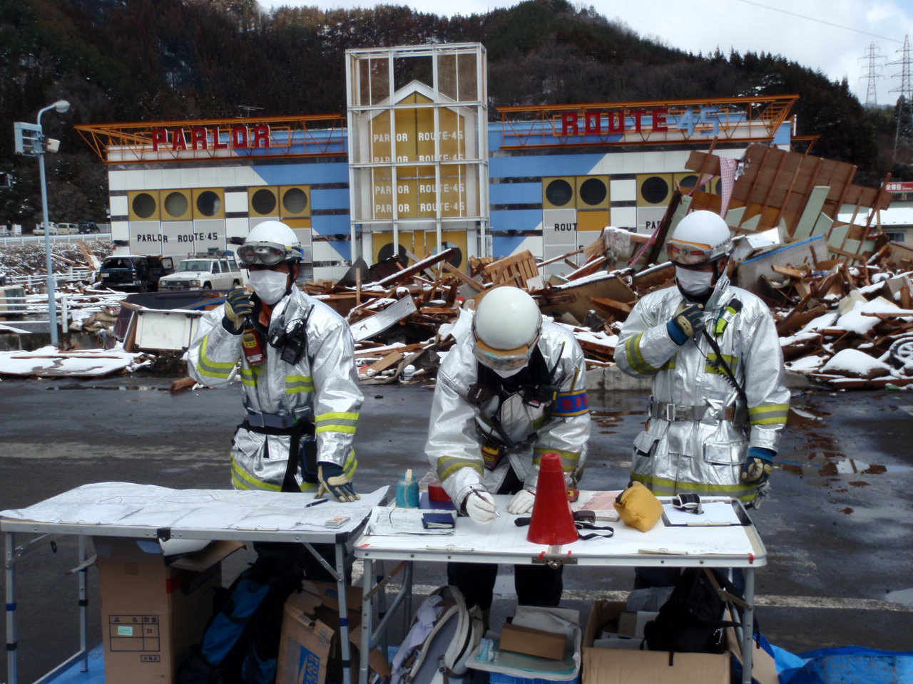 捜索活動の様子 拡大表示 ダウンロード 識別子 : 759 タイトルよみ : ソウサクカツドウノヨウス 說明・要約 : 駐車場に設置された消防本部の様子 作成者(撮影者) : 堺市消防局 作成者(撮影者)よみ : サカイシショウボウキョク 提供者 : 堺市消防局 提供者よみ : サカイシショウボウキョク 撮影(作成)場所 : 岩手県上閉伊郡大槌町 花輪田 撮影(作成)場所よみ : イワテケンカミヘイグンオオツチチョウ ハナワダ 作成日・撮影日 : 2011年 3月 16日 カテゴリー : 捜索 地域 : 桜木町・花輪田地区 備考 : 堺市消防局提供 震災事象 行政の執行 > 本部体制の強化 > 【防災関係機関(応援部隊)の支援】ご遺体の捜索から搬送、災害医療、消火活動、避難生活支援、物資搬送等、多岐に渡った。県から職員派遣等の対応があった。