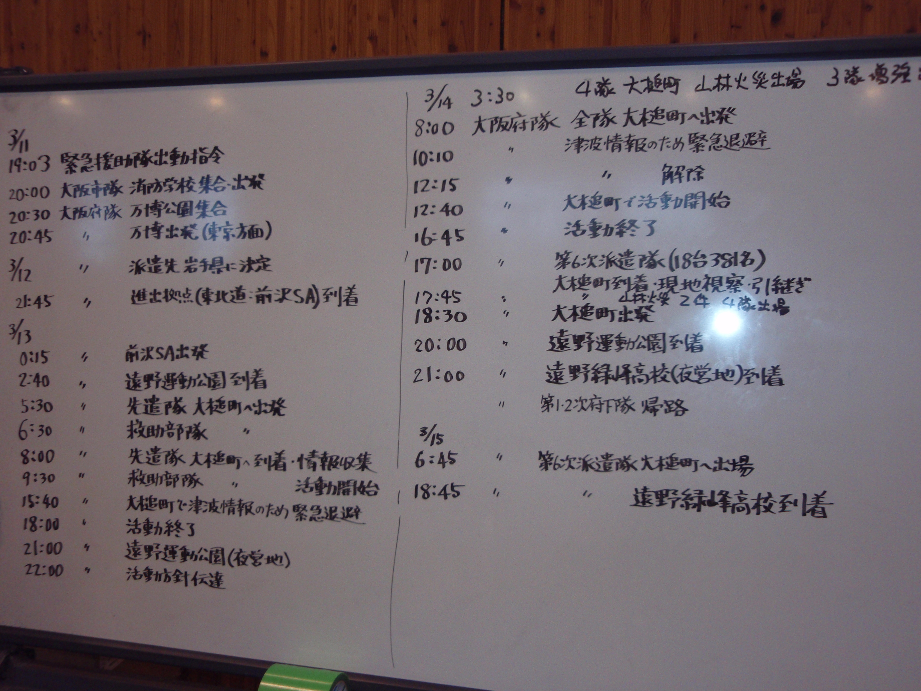 消防隊行動記録 拡大表示 ダウンロード 識別子 : 763 タイトルよみ : ショウボウタイコウドウキロク 說明・要約 : 黒板に記してある大阪市、大阪府隊の3/11から3/16の行動内容 作成者(撮影者) : 堺市消防局 作成者(撮影者)よみ : サカイシショウボウキョク 提供者 : 堺市消防局 提供者よみ : サカイシショウボウキョク 撮影(作成)場所 : 岩手県上閉伊郡大槌町 撮影(作成)場所よみ : イワテケンカミヘイグンオオツチチョウ 作成日・撮影日 : 2011年 3月 16日 カテゴリー : 捜索 地域 : その他 備考 : 堺市消防局提供 震災事象 行政の執行 > 本部体制の強化 > 【防災関係機関(応援部隊)の支援】ご遺体の捜索から搬送、災害医療、消火活動、避難生活支援、物資搬送等、多岐に渡った。県から職員派遣等の対応があった。