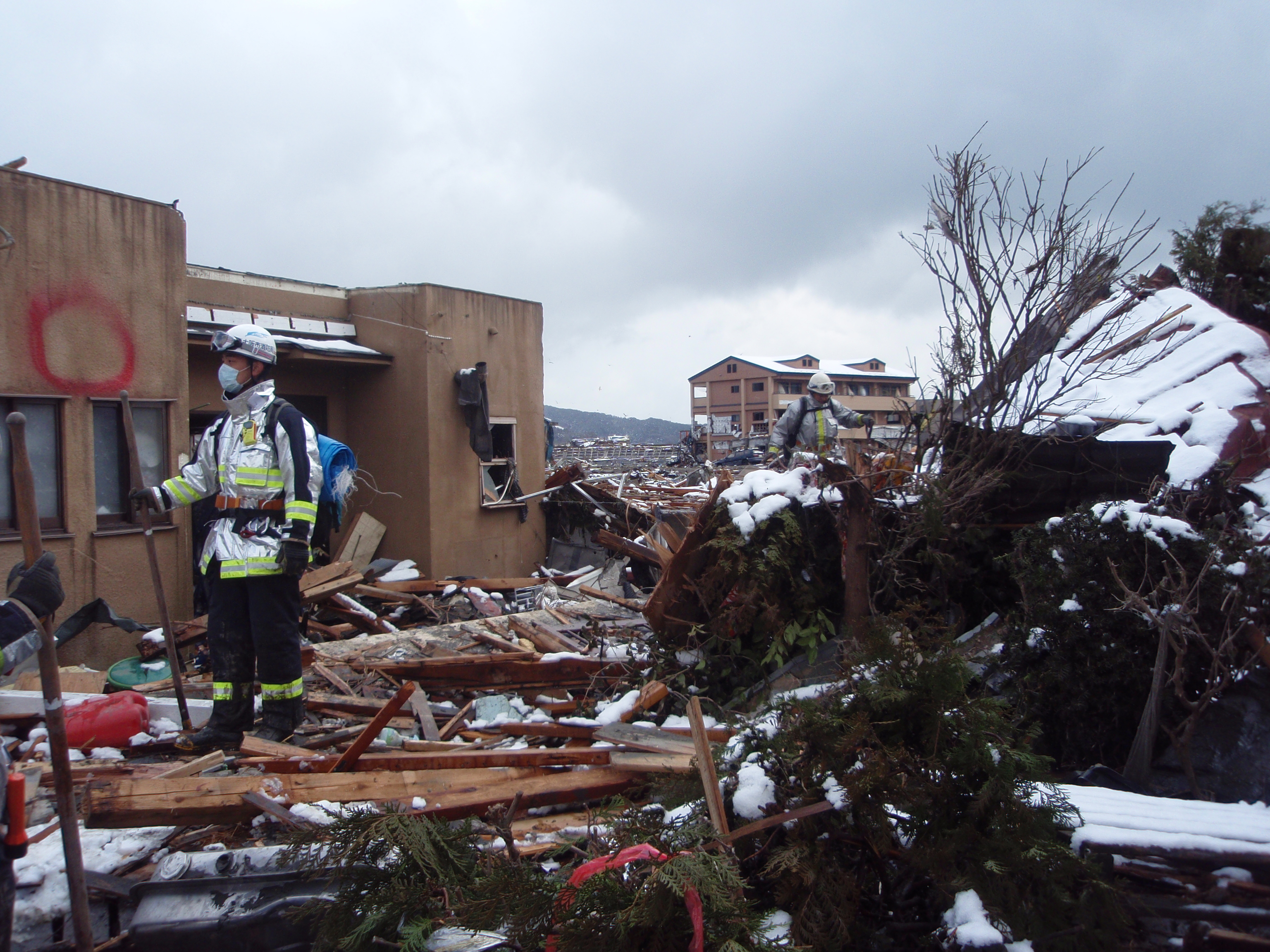 捜索活動の様子 拡大表示 ダウンロード 識別子 : 766 タイトルよみ : ソウサクカツドウノヨウス 說明・要約 : ガレキの中で捜索活動をしている消防隊員の様子 作成者(撮影者) : 堺市消防局 作成者(撮影者)よみ : サカイシショウボウキョク 提供者 : 堺市消防局 提供者よみ : サカイシショウボウキョク 撮影(作成)場所 : 岩手県上閉伊郡大槌町 撮影(作成)場所よみ : イワテケンカミヘイグンオオツチチョウ 作成日・撮影日 : 2011年 3月 16日 カテゴリー : 捜索 地域 : 町方地区 備考 : 堺市消防局提供 震災事象 行政の執行 > 本部体制の強化 > 【防災関係機関(応援部隊)の支援】ご遺体の捜索から搬送、災害医療、消火活動、避難生活支援、物資搬送等、多岐に渡った。県から職員派遣等の対応があった。