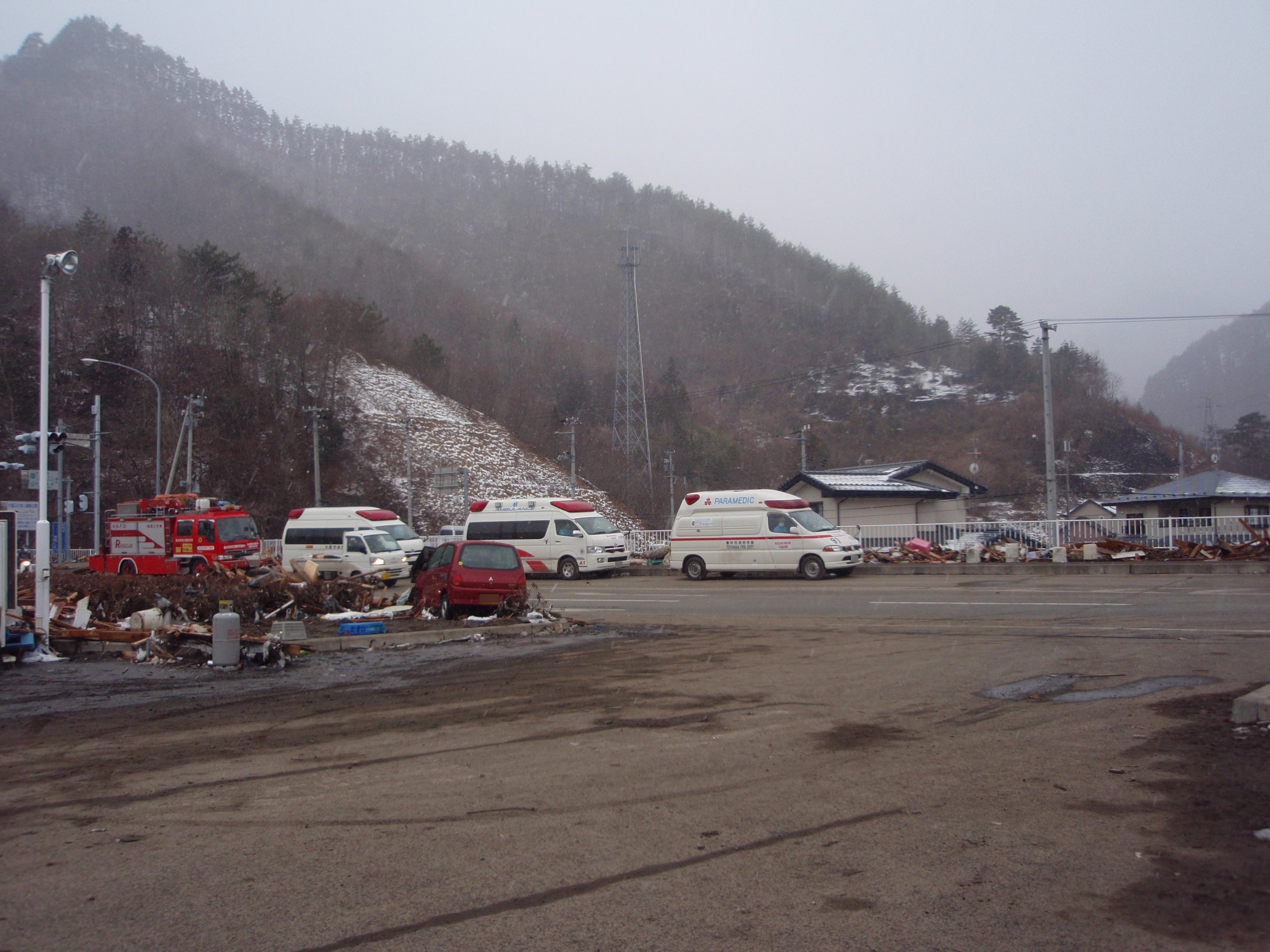 捜索活動の様子 拡大表示 ダウンロード 識別子 : 779 タイトルよみ : ソウサクカツドウノヨウス 說明・要約 : 駐車場に駐車している消防車両と救急車両の様子 作成者(撮影者) : 堺市消防局 作成者(撮影者)よみ : サカイシショウボウキョク 提供者 : 堺市消防局 提供者よみ : サカイシショウボウキョク 撮影(作成)場所 : 岩手県上閉伊郡大槌町 花輪田 撮影(作成)場所よみ : イワテケンカミヘイグンオオツチチョウ ハナワダ 作成日・撮影日 : 2011年 3月 16日 カテゴリー : 捜索 地域 : 桜木町・花輪田地区 備考 : 堺市消防局提供 震災事象 行政の執行 > 本部体制の強化 > 【防災関係機関(応援部隊)の支援】ご遺体の捜索から搬送、災害医療、消火活動、避難生活支援、物資搬送等、多岐に渡った。県から職員派遣等の対応があった。