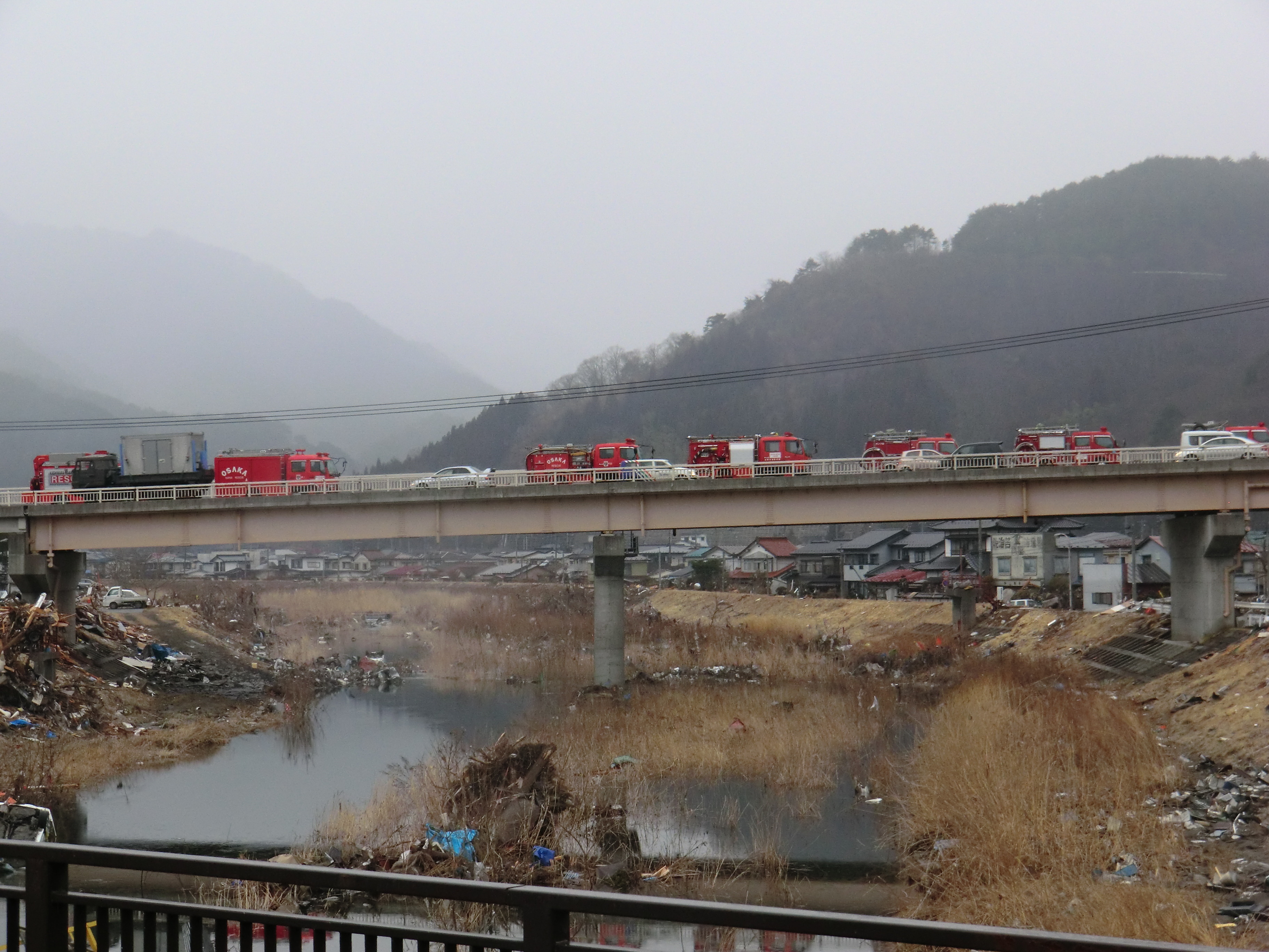 捜索活動の様子 拡大表示 ダウンロード 識別子 : 831 タイトルよみ : ソウサクカツドウノヨウス 說明・要約 : 国道45号線の橋の上で隊列を組んで駐車している消防車両 作成者(撮影者) : 堺市消防局 作成者(撮影者)よみ : サカイシショウボウキョク 提供者 : 堺市消防局 提供者よみ : サカイシショウボウキョク 撮影(作成)場所 : 岩手県上閉伊郡大槌町 撮影(作成)場所よみ : イワテケンカミヘイグンオオツチチョウ 作成日・撮影日 : 2011年 3月 15日 カテゴリー : 捜索 地域 : 桜木町・花輪田地区 備考 : 堺市消防局提供 震災事象 行政の執行 > 本部体制の強化 > 【防災関係機関(応援部隊)の支援】ご遺体の捜索から搬送、災害医療、消火活動、避難生活支援、物資搬送等、多岐に渡った。県から職員派遣等の対応があった。