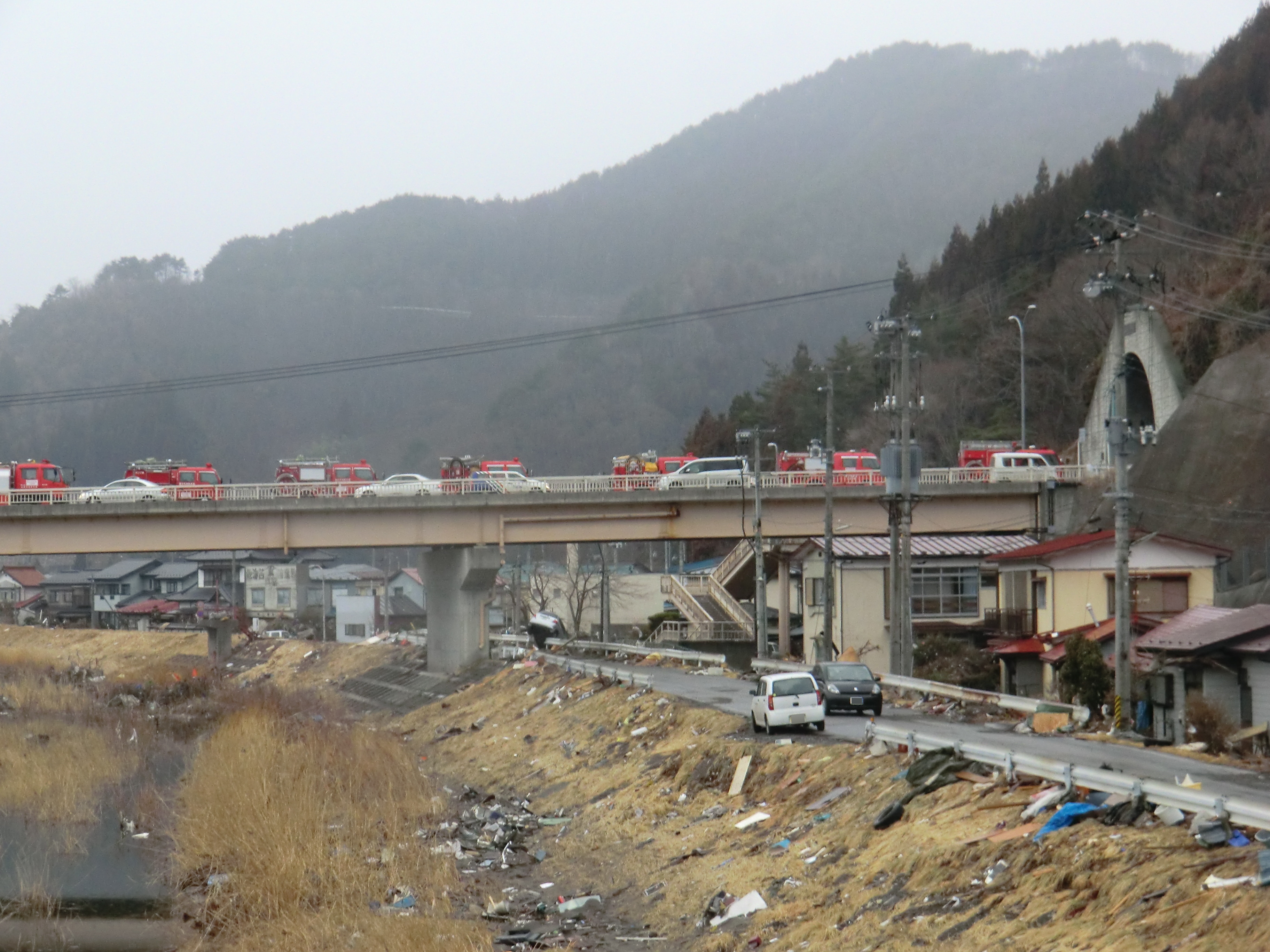 捜索活動の様子 拡大表示 ダウンロード 識別子 : 832 タイトルよみ : ソウサクカツドウノヨウス 說明・要約 : 国道45号線の橋の上で隊列を組んで駐車している消防車両 作成者(撮影者) : 堺市消防局 作成者(撮影者)よみ : サカイシショウボウキョク 提供者 : 堺市消防局 提供者よみ : サカイシショウボウキョク 撮影(作成)場所 : 岩手県上閉伊郡大槌町 撮影(作成)場所よみ : イワテケンカミヘイグンオオツチチョウ 作成日・撮影日 : 2011年 3月 15日 カテゴリー : 捜索 地域 : 桜木町・花輪田地区 備考 : 堺市消防局提供 震災事象 行政の執行 > 本部体制の強化 > 【防災関係機関(応援部隊)の支援】ご遺体の捜索から搬送、災害医療、消火活動、避難生活支援、物資搬送等、多岐に渡った。県から職員派遣等の対応があった。