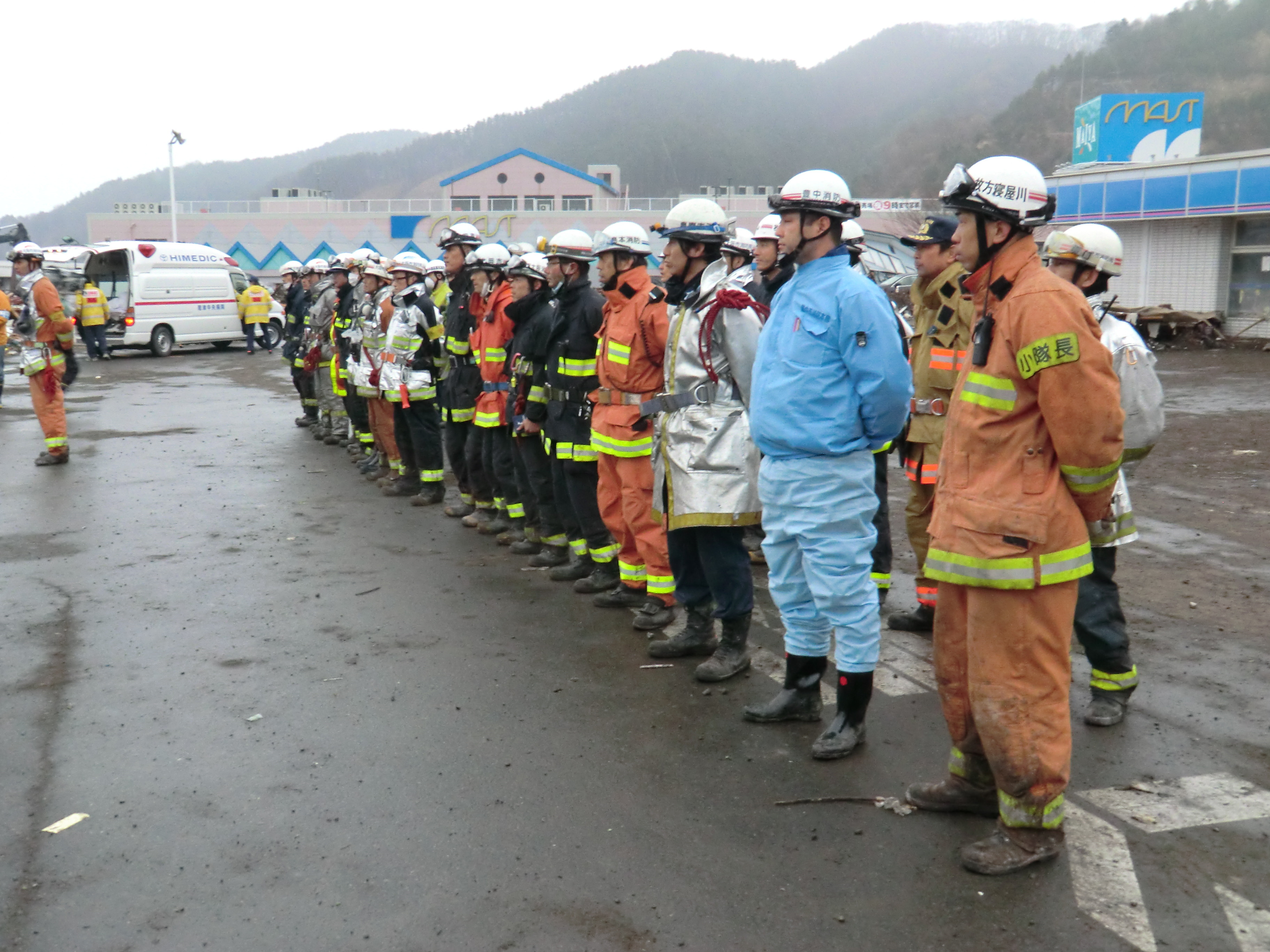捜索活動の様子 拡大表示 ダウンロード 識別子 : 835 タイトルよみ : ソウサクカツドウノヨウス 說明・要約 : 駐車場に整列している消防隊員の様子 作成者(撮影者) : 堺市消防局 作成者(撮影者)よみ : サカイシショウボウキョク 提供者 : 堺市消防局 提供者よみ : サカイシショウボウキョク 撮影(作成)場所 : 岩手県上閉伊郡大槌町 花輪田 撮影(作成)場所よみ : イワテケンカミヘイグンオオツチチョウ ハナワダ 作成日・撮影日 : 2011年 3月 15日 カテゴリー : 捜索 地域 : 桜木町・花輪田地区 備考 : 堺市消防局提供 震災事象 行政の執行 > 本部体制の強化 > 【防災関係機関(応援部隊)の支援】ご遺体の捜索から搬送、災害医療、消火活動、避難生活支援、物資搬送等、多岐に渡った。県から職員派遣等の対応があった。