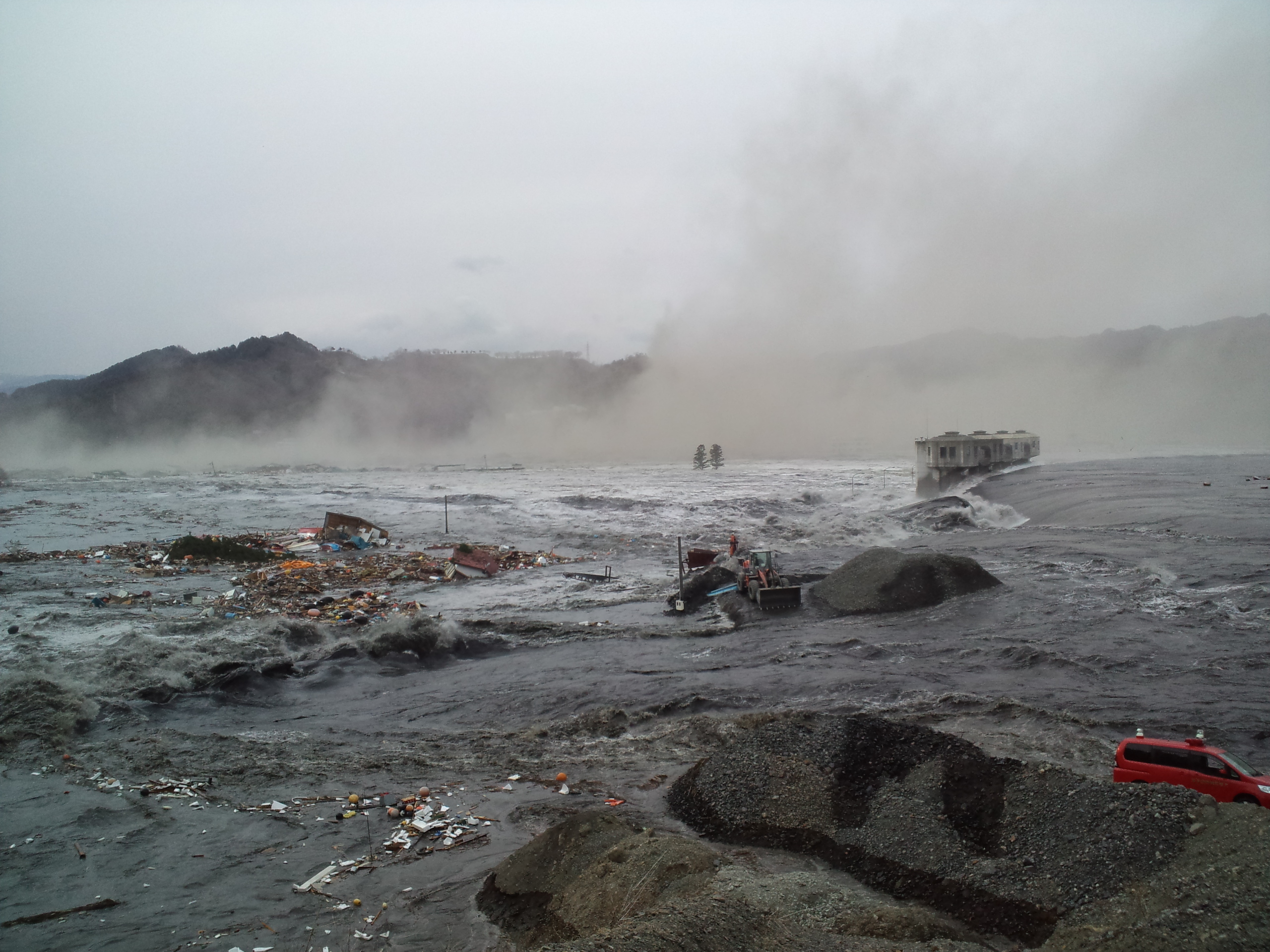 津波直後の様子 拡大表示 ダウンロード 識別子 : 15171 タイトルよみ : つなみちょくごのようす 說明・要約 : 大槌水門の様子。海水は汚泥で黒く、小枕付近は土埃で煙って見えない。ブルトーザーが流されていく様子から引き波の強さがわかる。 作成者(撮影者) : 不明 作成者(撮影者)よみ : 提供者 : 大槌町 提供者よみ : 撮影(作成)場所 : 岩手県上閉伊郡大槌町 新港町方向からの撮影と思われる 撮影(作成)場所よみ : イワテケンカミヘイグンオオツチチョウ 作成日・撮影日 : 2011年 3月 11日 カテゴリー : 発災 地域 : 町方地区 備考 :